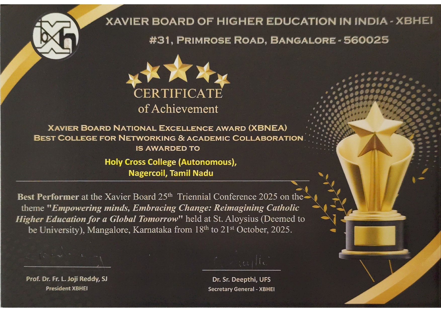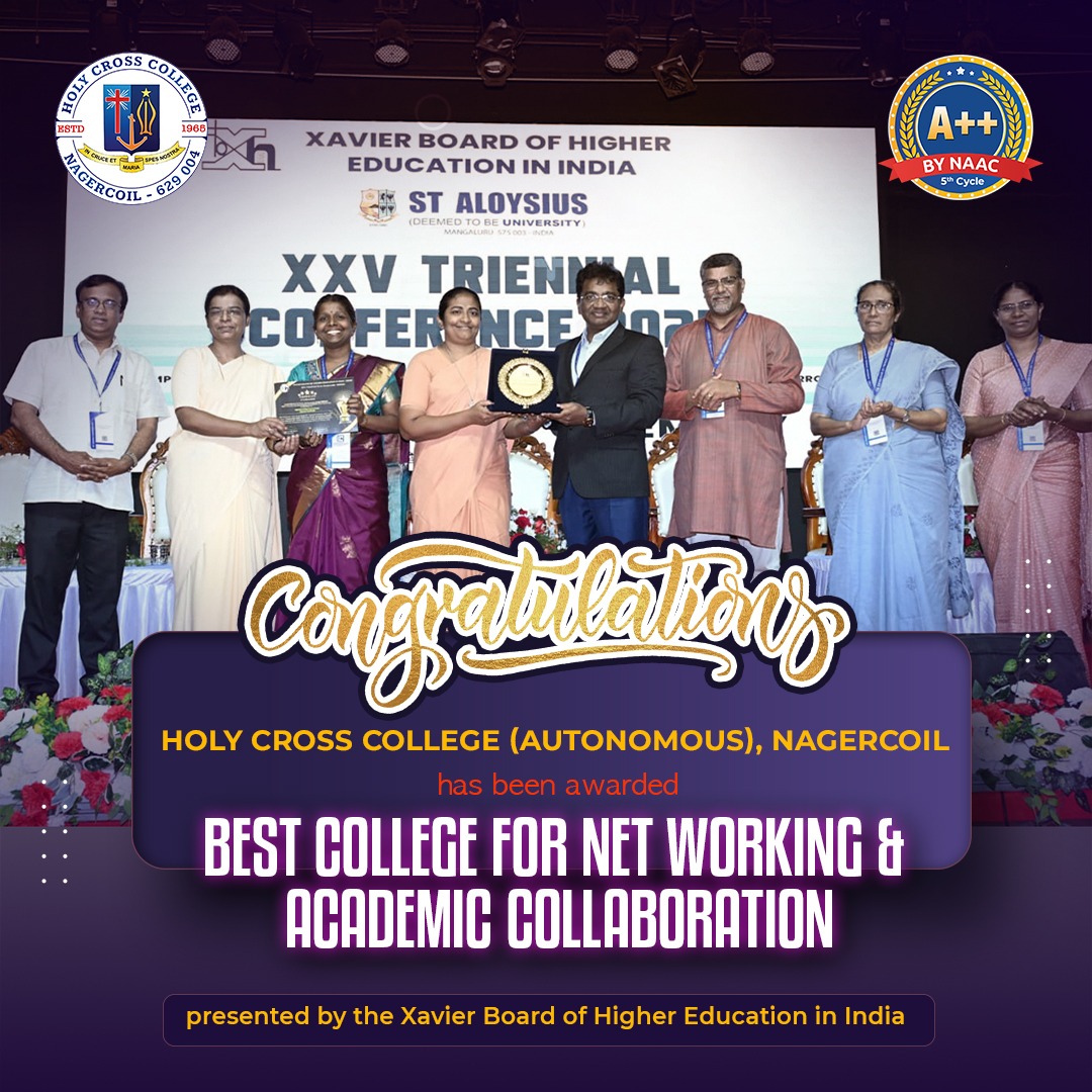 Holy Cross College was established in 1965 - the first women’s college in Kanyakumari district. It is a very prestigious college with a strong determination to empower women personally and professionally. I firmly believe that through education, women can fabricate an identity of their own. They can pursue their dreams and move ahead in their life with strong determination, respect, love, and faith. Under the efficient and committed management of the sisters of the Cross of Chavanod, the college continues to sow the seeds of education to women thereby nourishing them physically, emotionally, intellectually, spiritually, and socially.