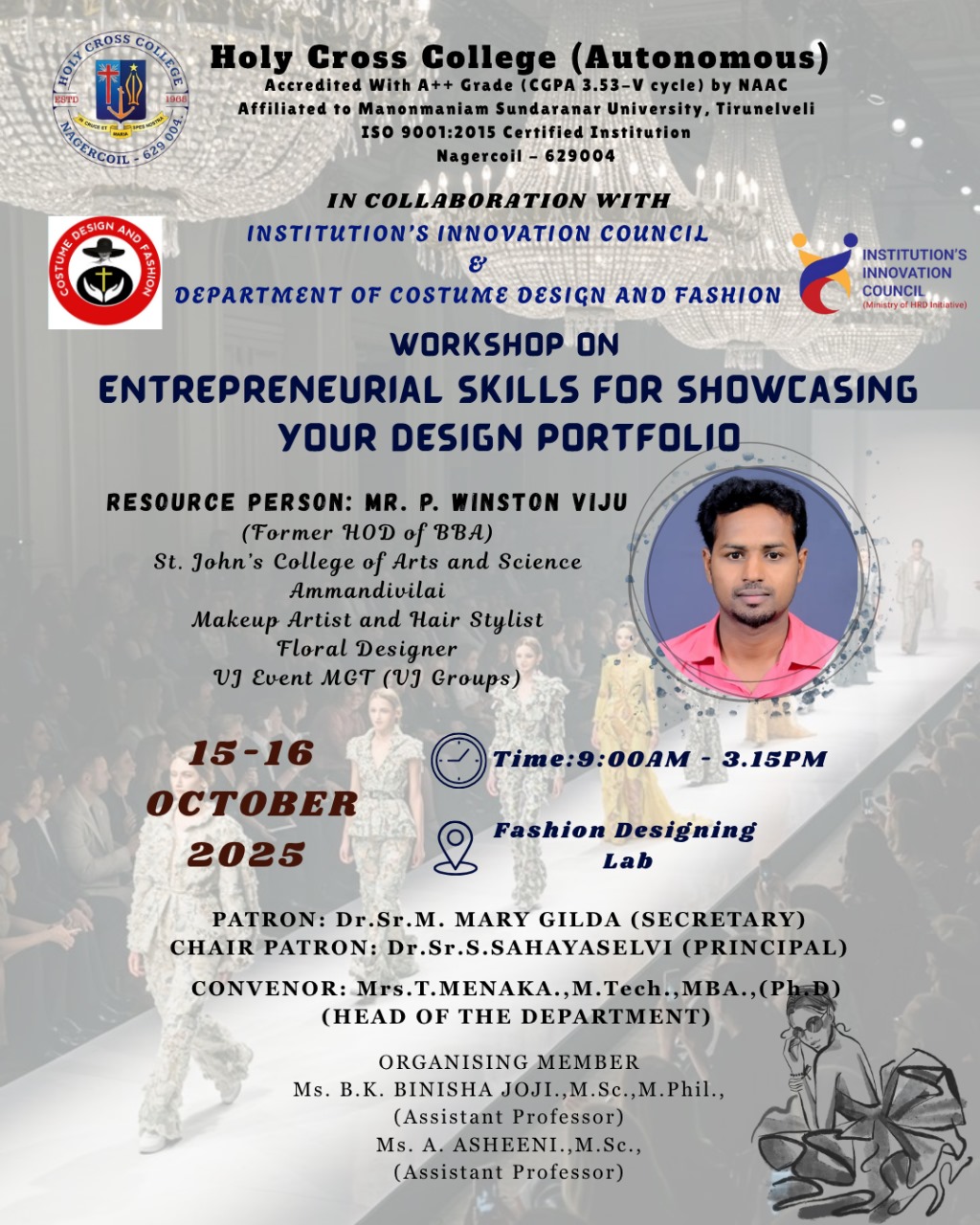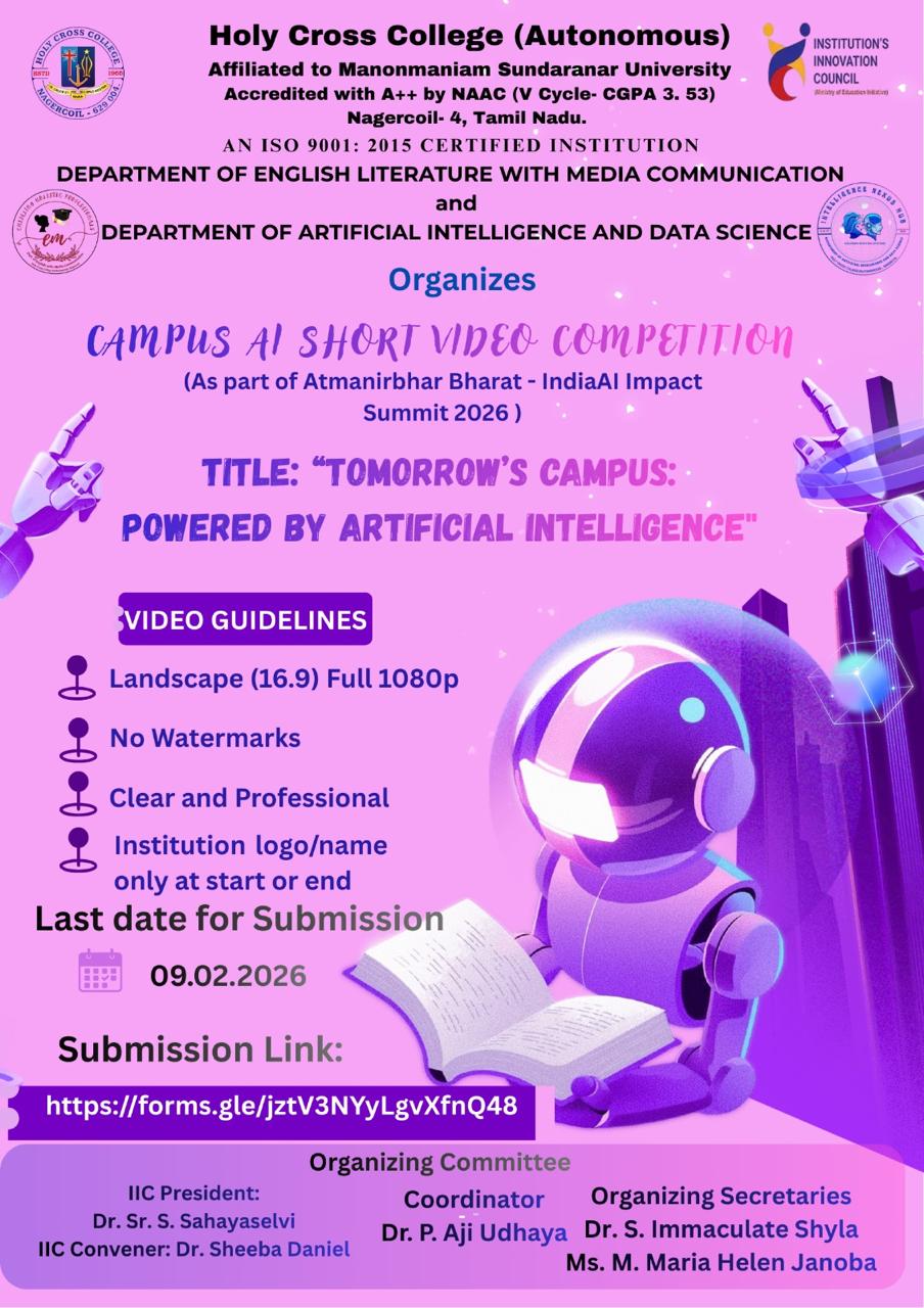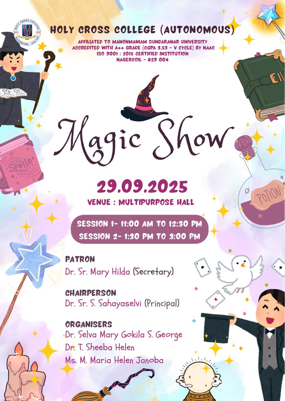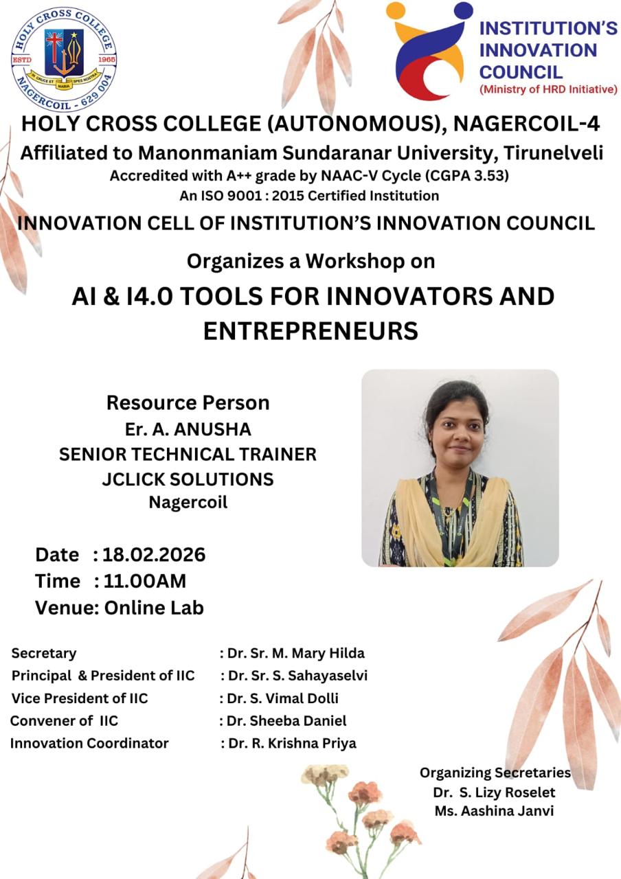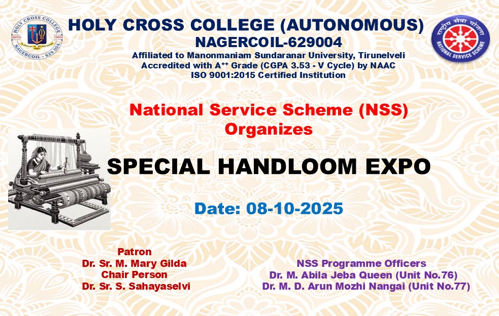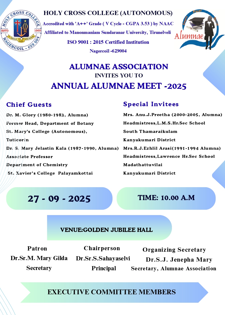 Holy Cross College was established in 1965 - the first women’s college in Kanyakumari district. It is a very prestigious college with a strong determination to empower women personally and professionally. I firmly believe that through education, women can fabricate an identity of their own. They can pursue their dreams and move ahead in their life with strong determination, respect, love, and faith. Under the efficient and committed management of the sisters of the Cross of Chavanod, the college continues to sow the seeds of education to women thereby nourishing them physically, emotionally, intellectually, spiritually, and socially.