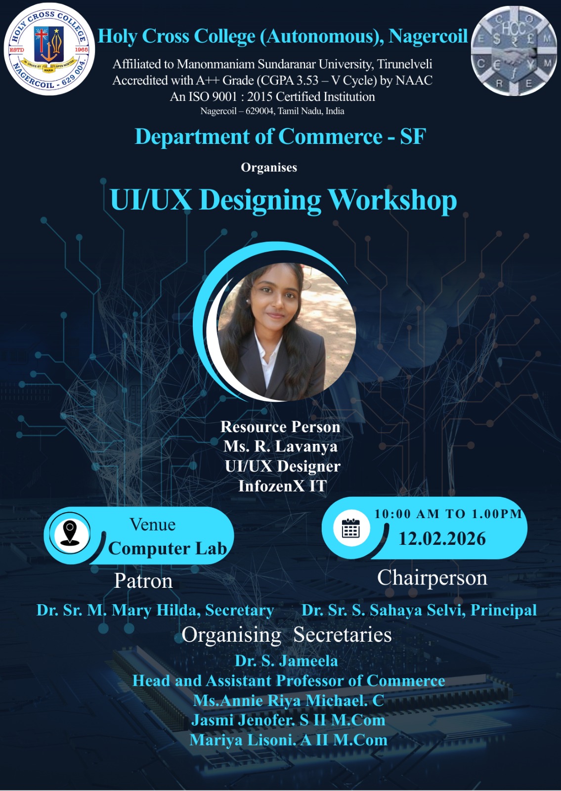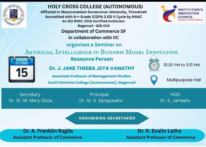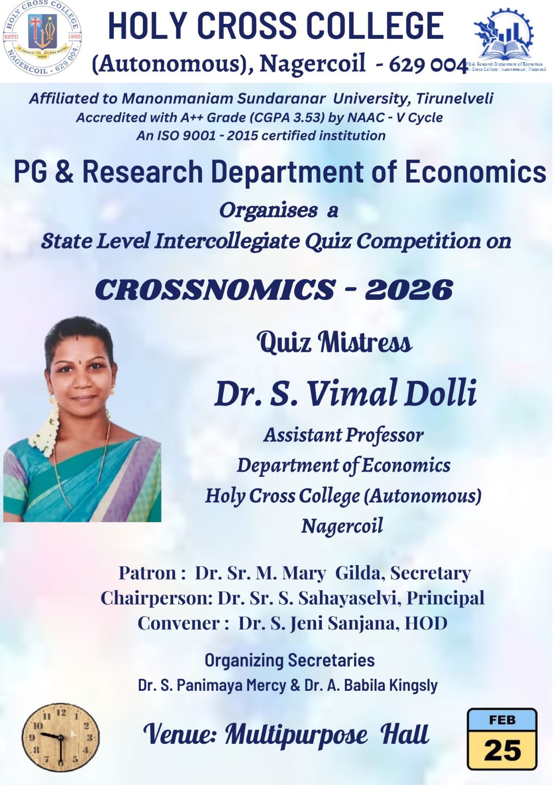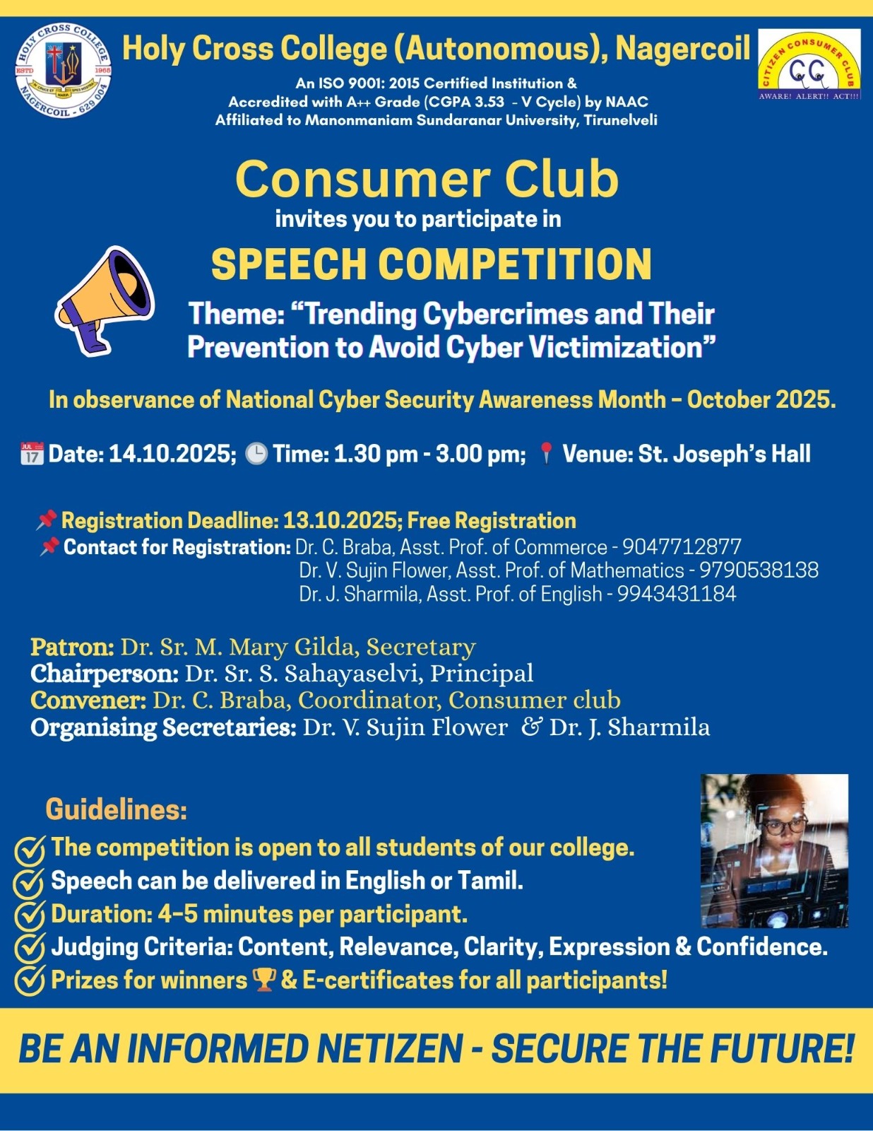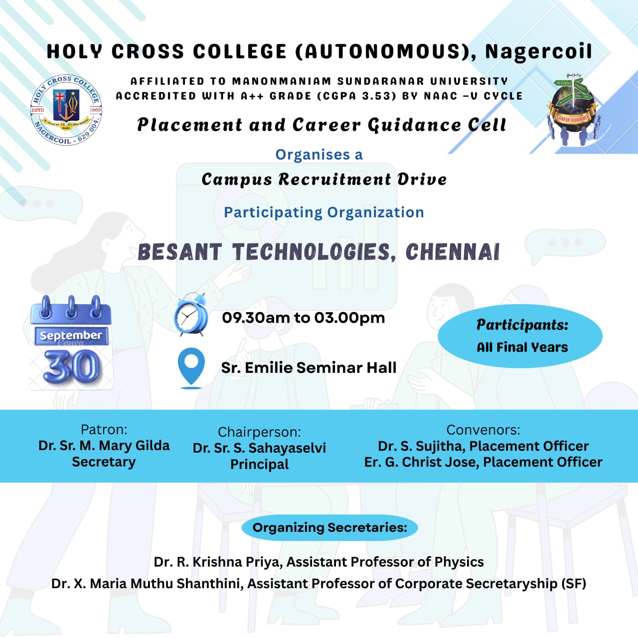 Holy Cross College was established in 1965 - the first women’s college in Kanyakumari district. It is a very prestigious college with a strong determination to empower women personally and professionally. I firmly believe that through education, women can fabricate an identity of their own. They can pursue their dreams and move ahead in their life with strong determination, respect, love, and faith. Under the efficient and committed management of the sisters of the Cross of Chavanod, the college continues to sow the seeds of education to women thereby nourishing them physically, emotionally, intellectually, spiritually, and socially.