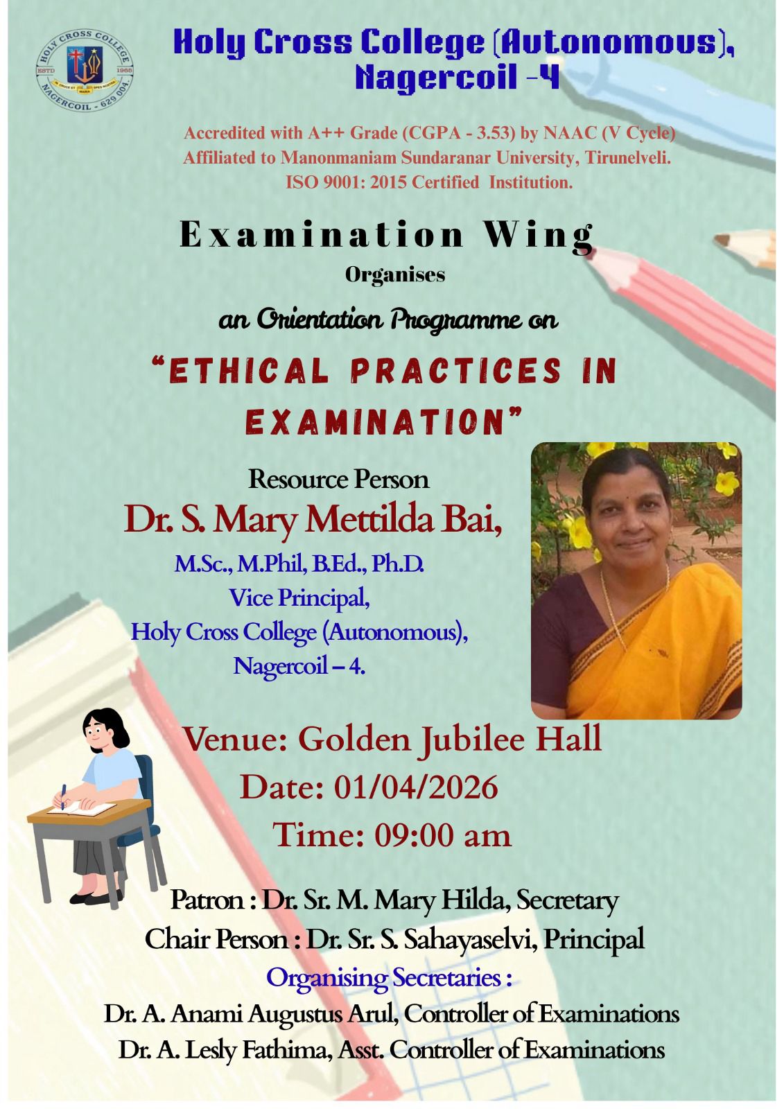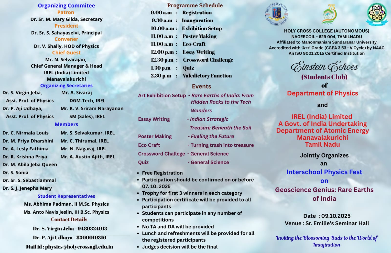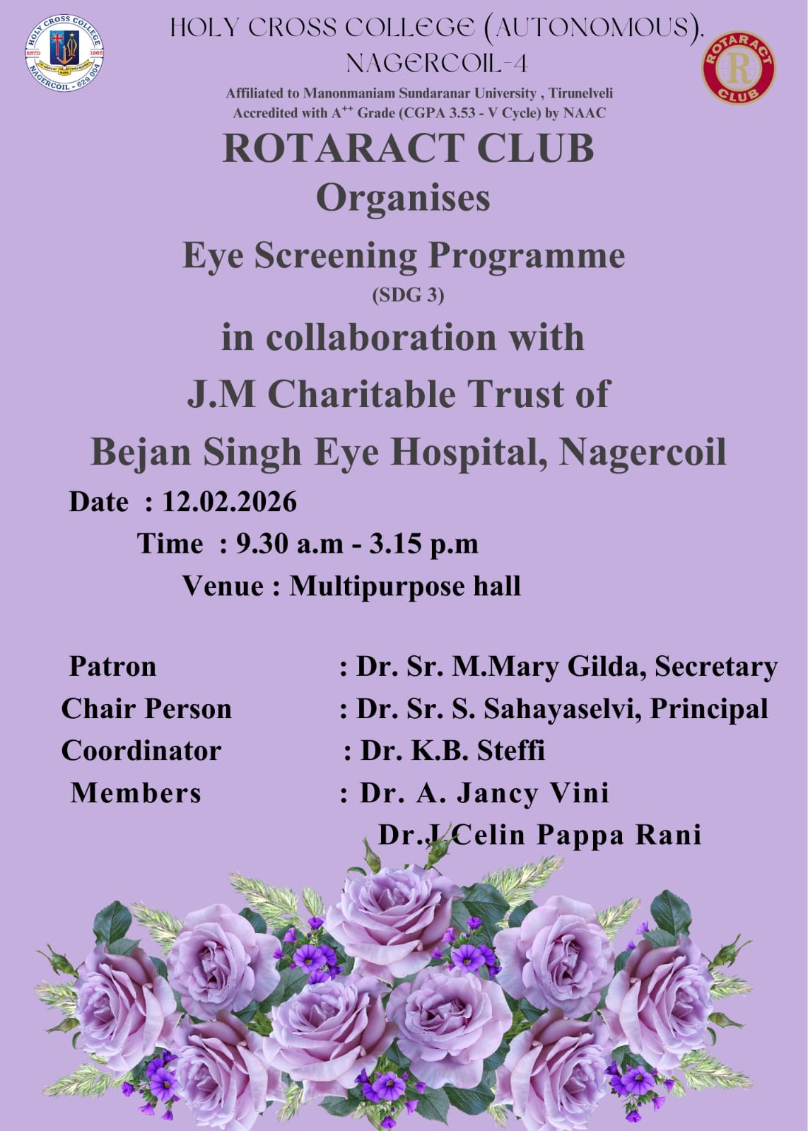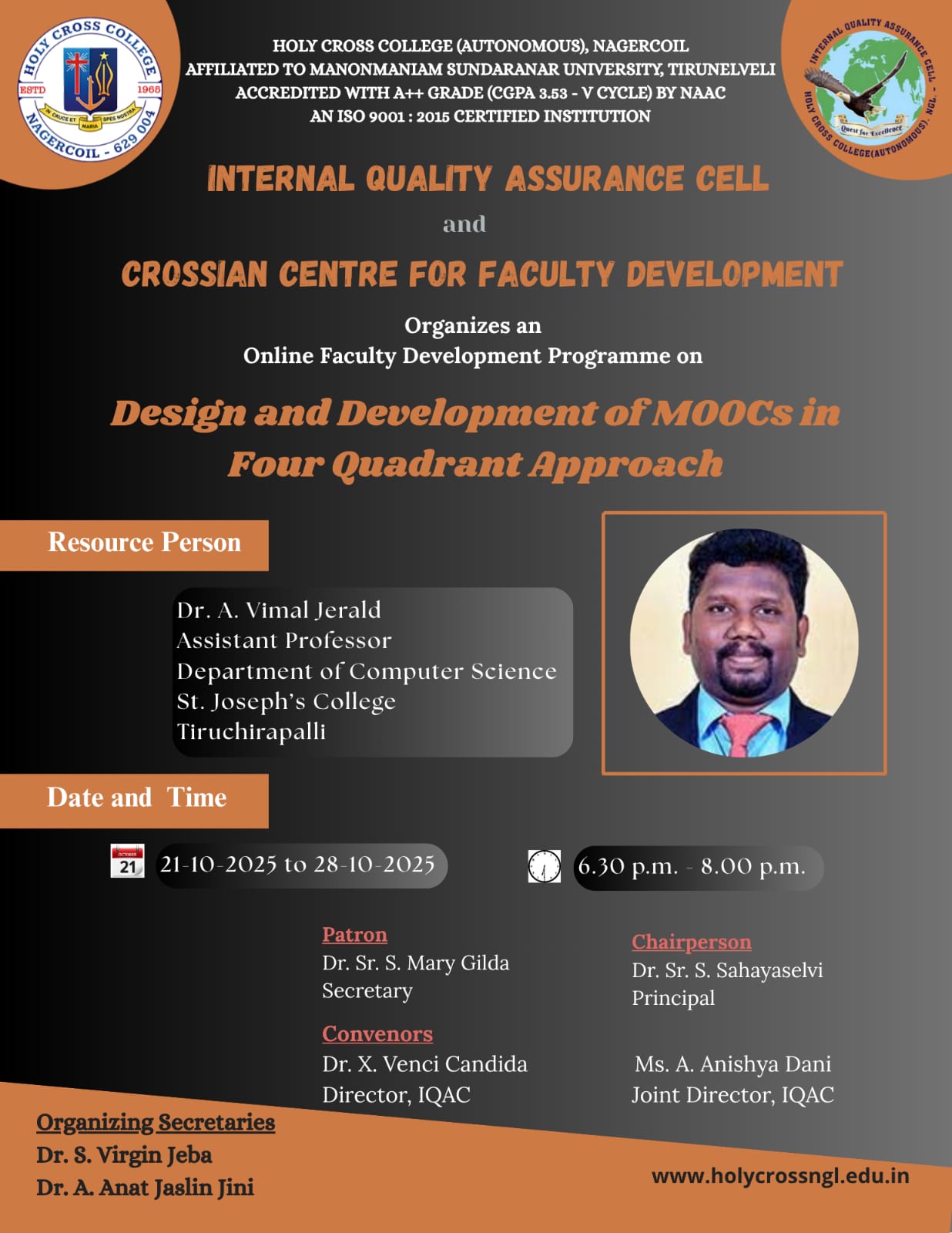 Holy Cross College was established in 1965 - the first women’s college in Kanyakumari district. It is a very prestigious college with a strong determination to empower women personally and professionally. I firmly believe that through education, women can fabricate an identity of their own. They can pursue their dreams and move ahead in their life with strong determination, respect, love, and faith. Under the efficient and committed management of the sisters of the Cross of Chavanod, the college continues to sow the seeds of education to women thereby nourishing them physically, emotionally, intellectually, spiritually, and socially.