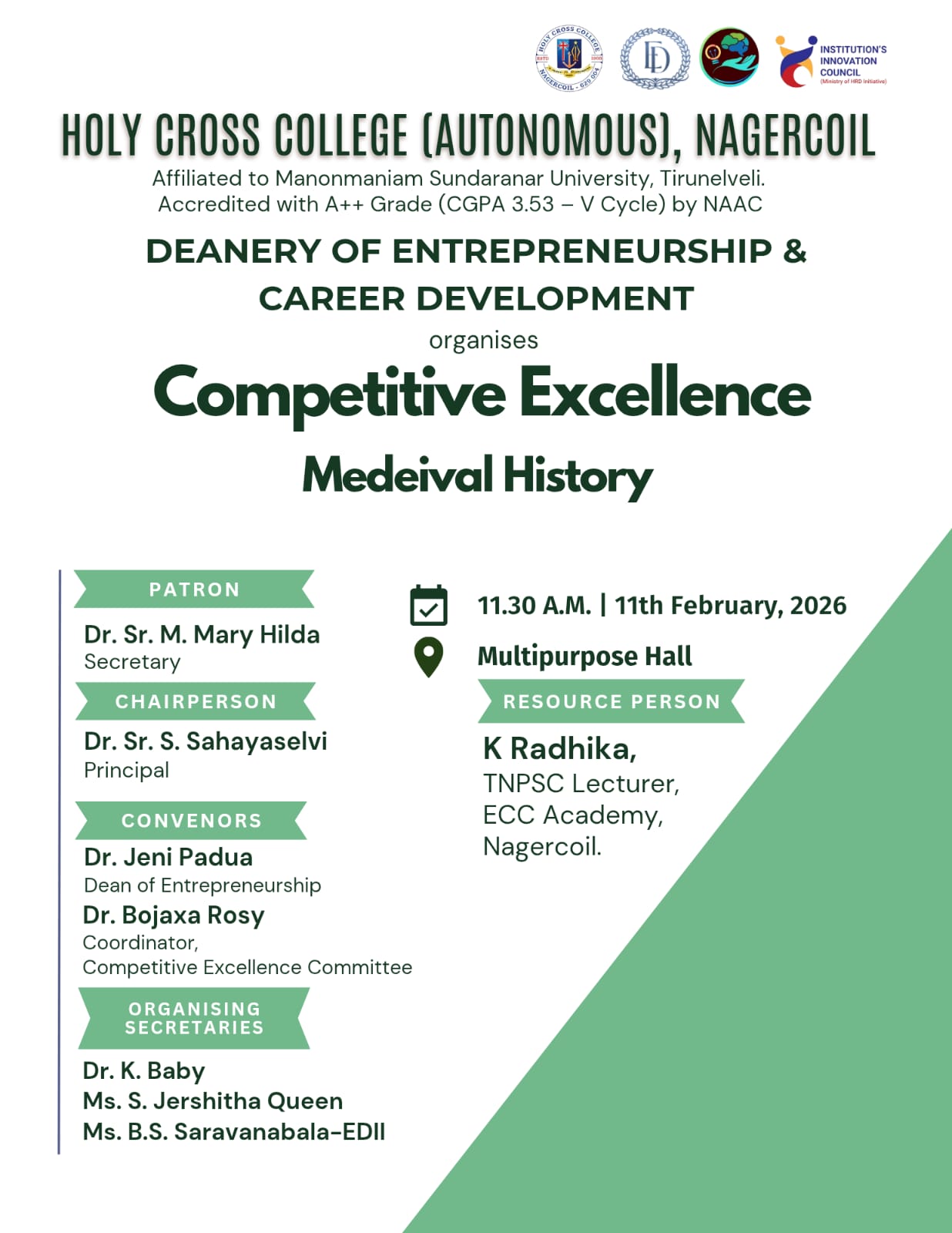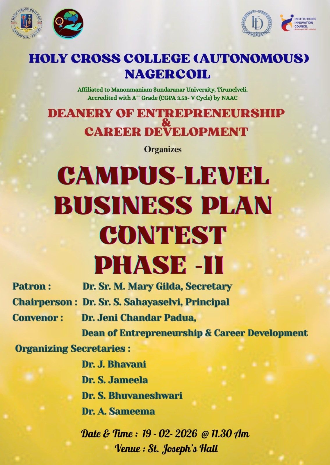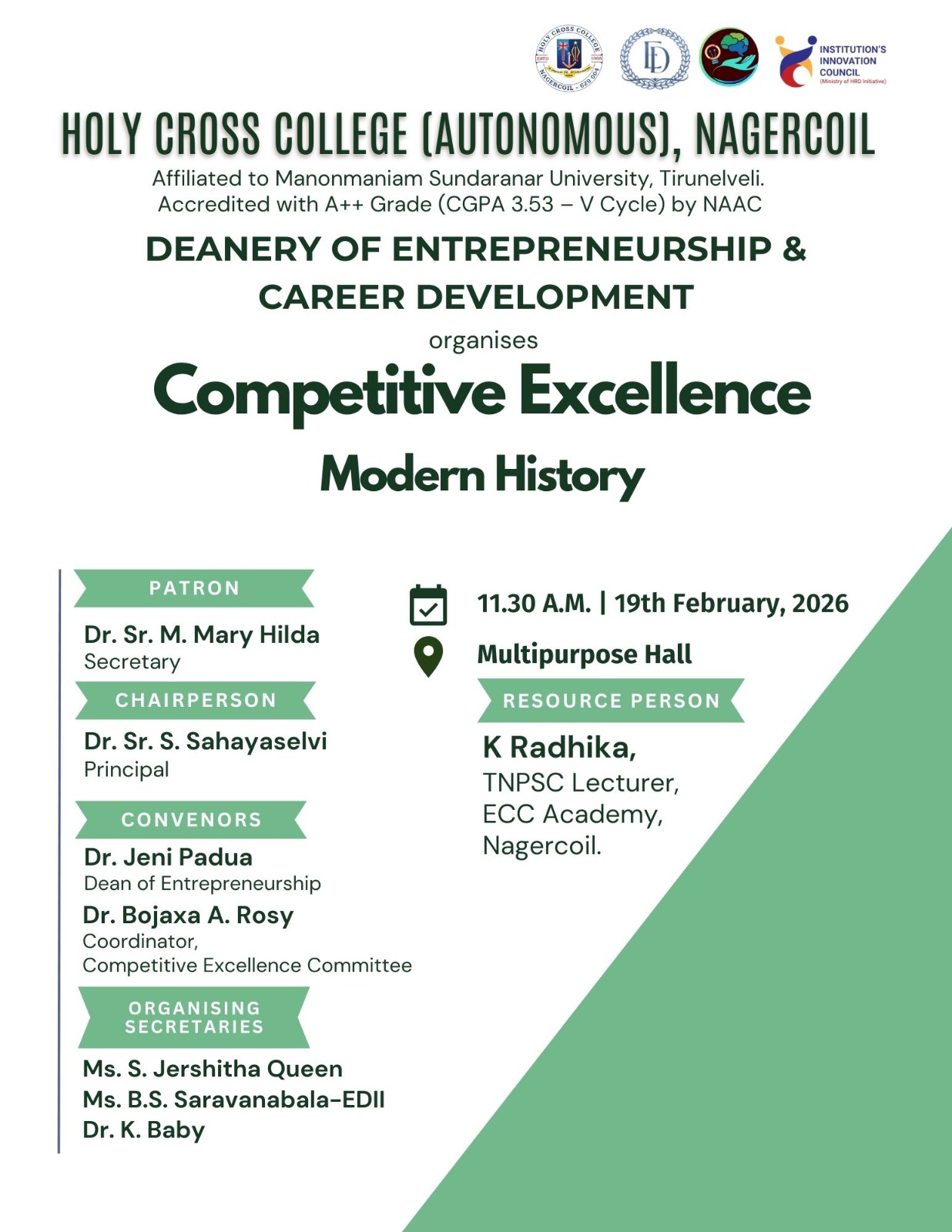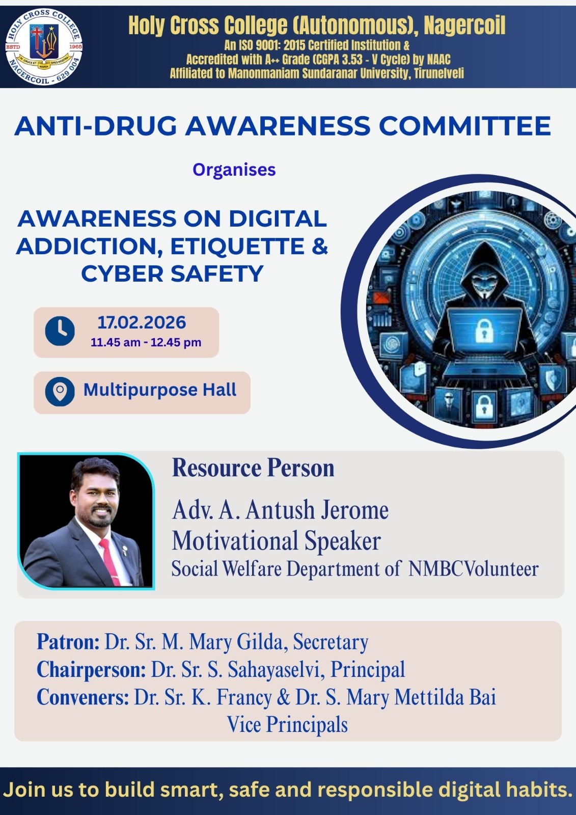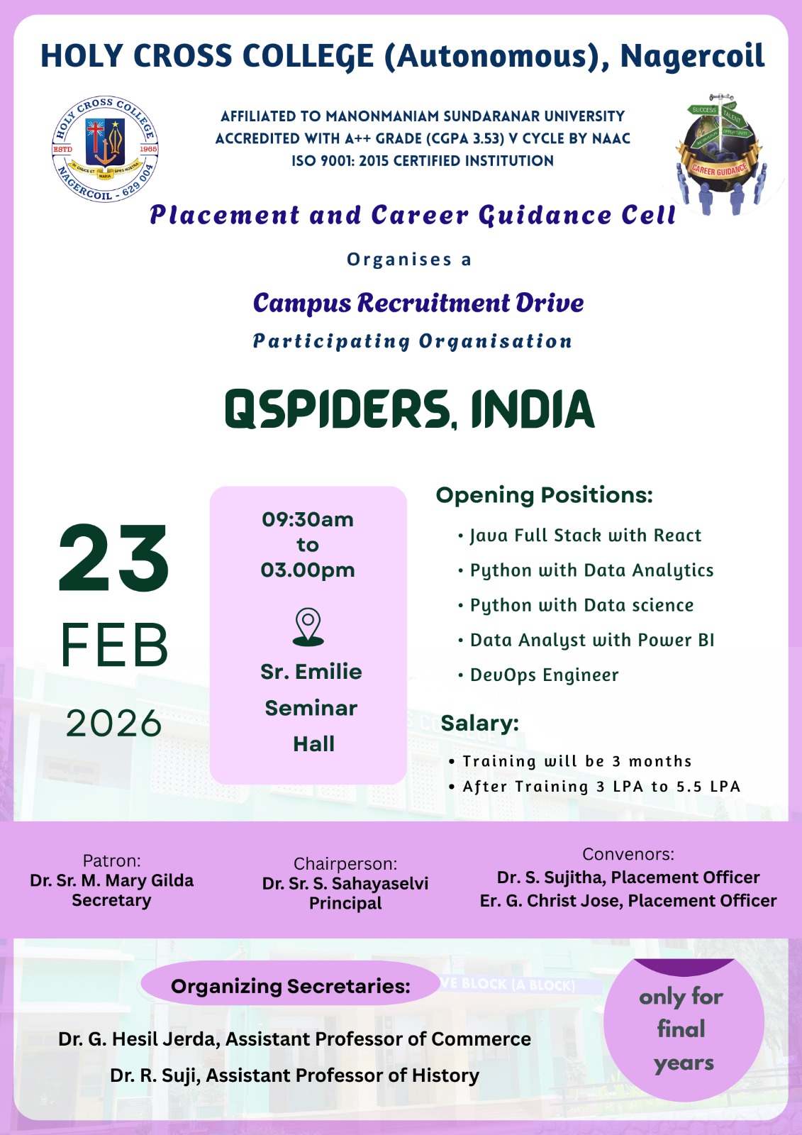 Holy Cross College was established in 1965 - the first women’s college in Kanyakumari district. It is a very prestigious college with a strong determination to empower women personally and professionally. I firmly believe that through education, women can fabricate an identity of their own. They can pursue their dreams and move ahead in their life with strong determination, respect, love, and faith. Under the efficient and committed management of the sisters of the Cross of Chavanod, the college continues to sow the seeds of education to women thereby nourishing them physically, emotionally, intellectually, spiritually, and socially.