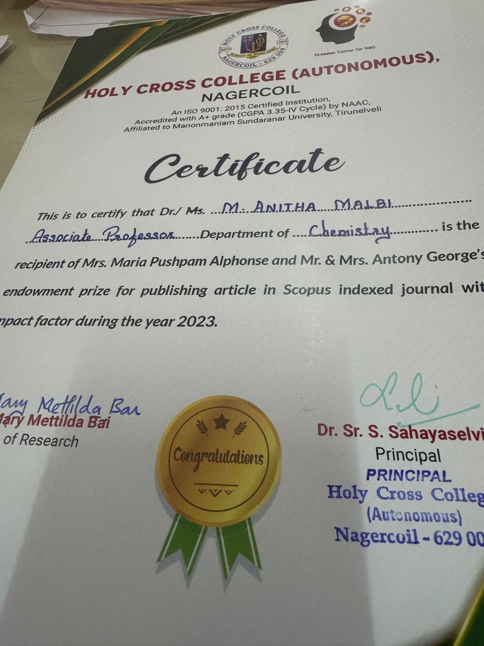 Mrs. S. Maria Pushpam Alphonse Endowment Prize |