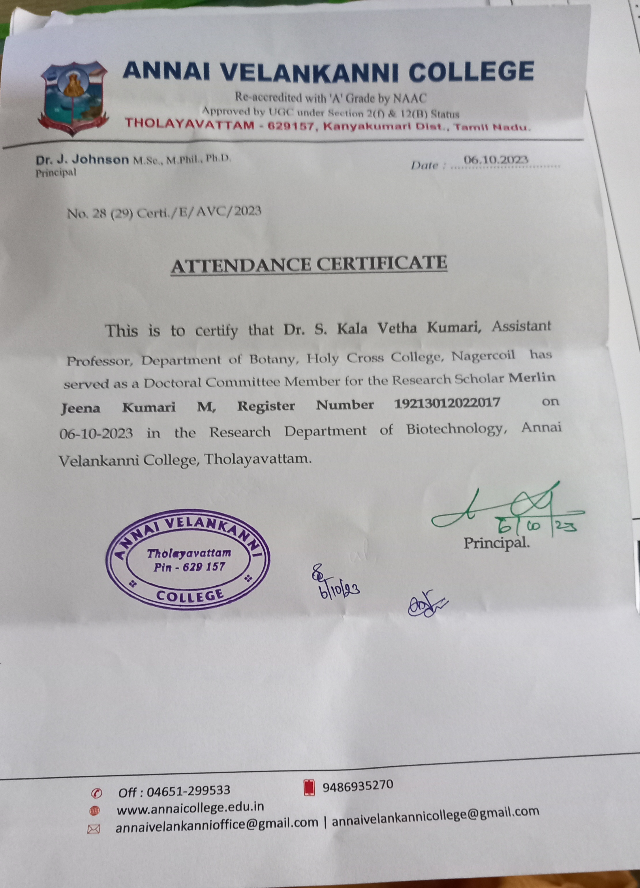 Dept of Biotechnology, Holy Cross College ( Autonomous) Nagercoil |