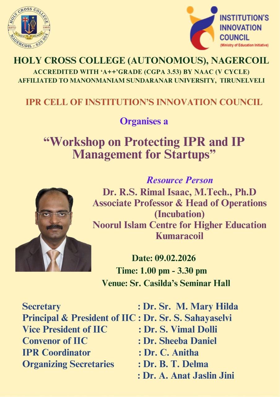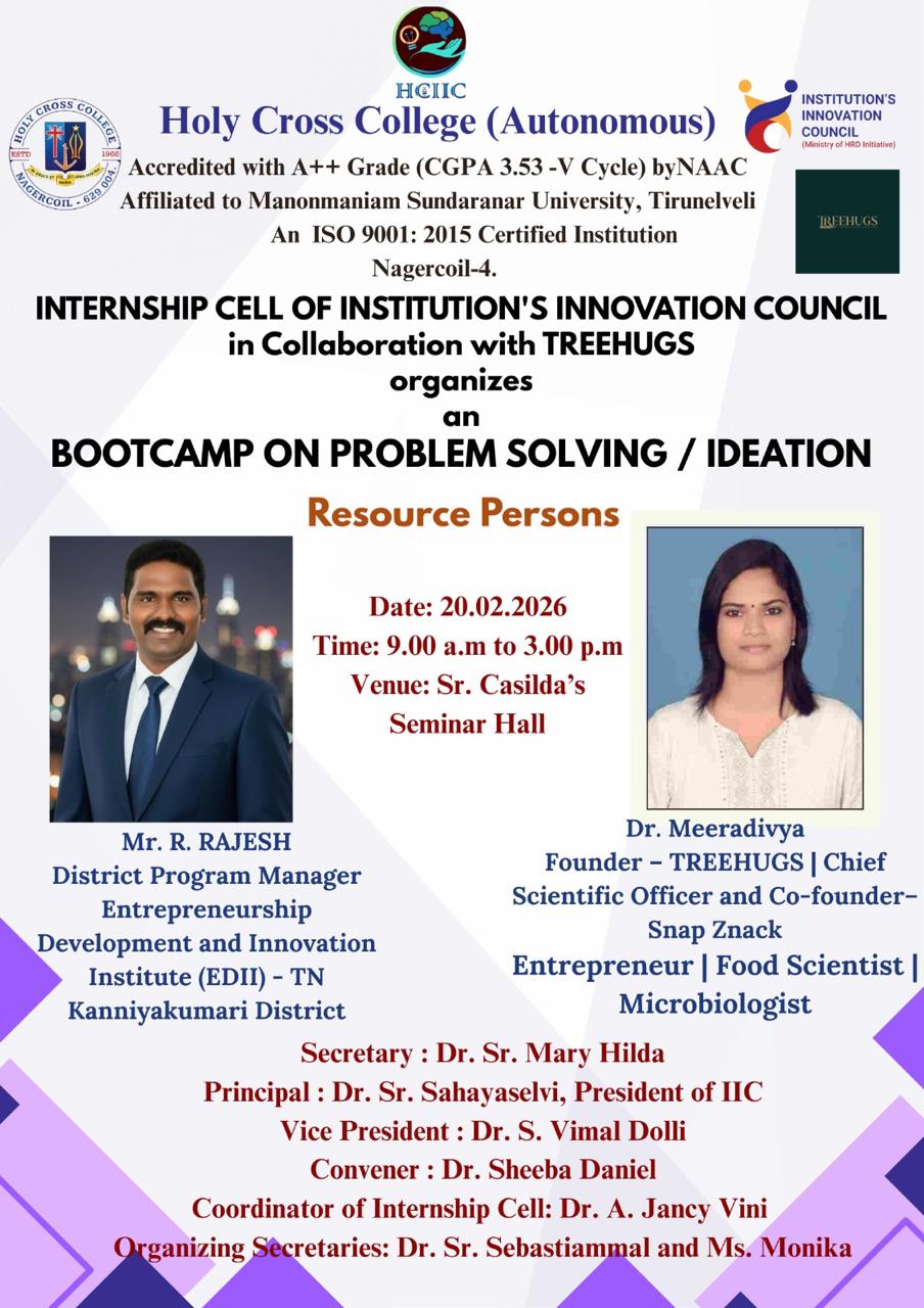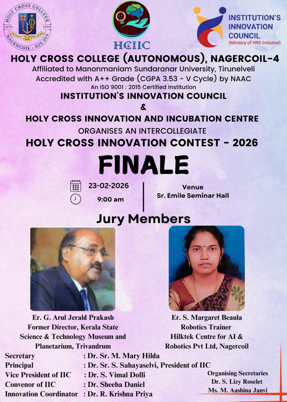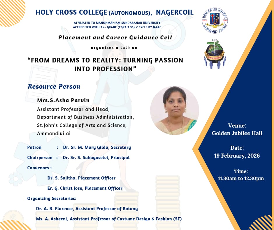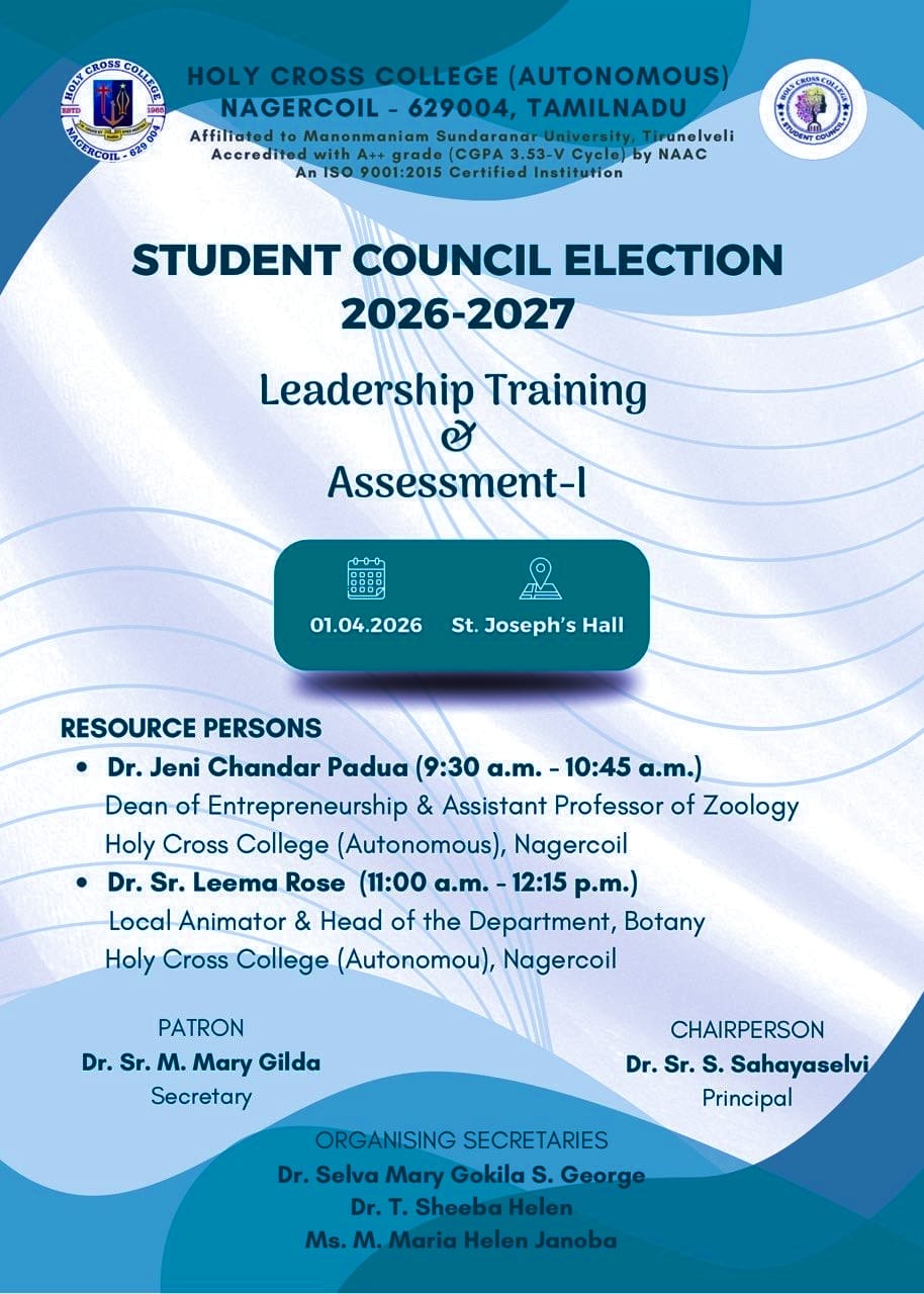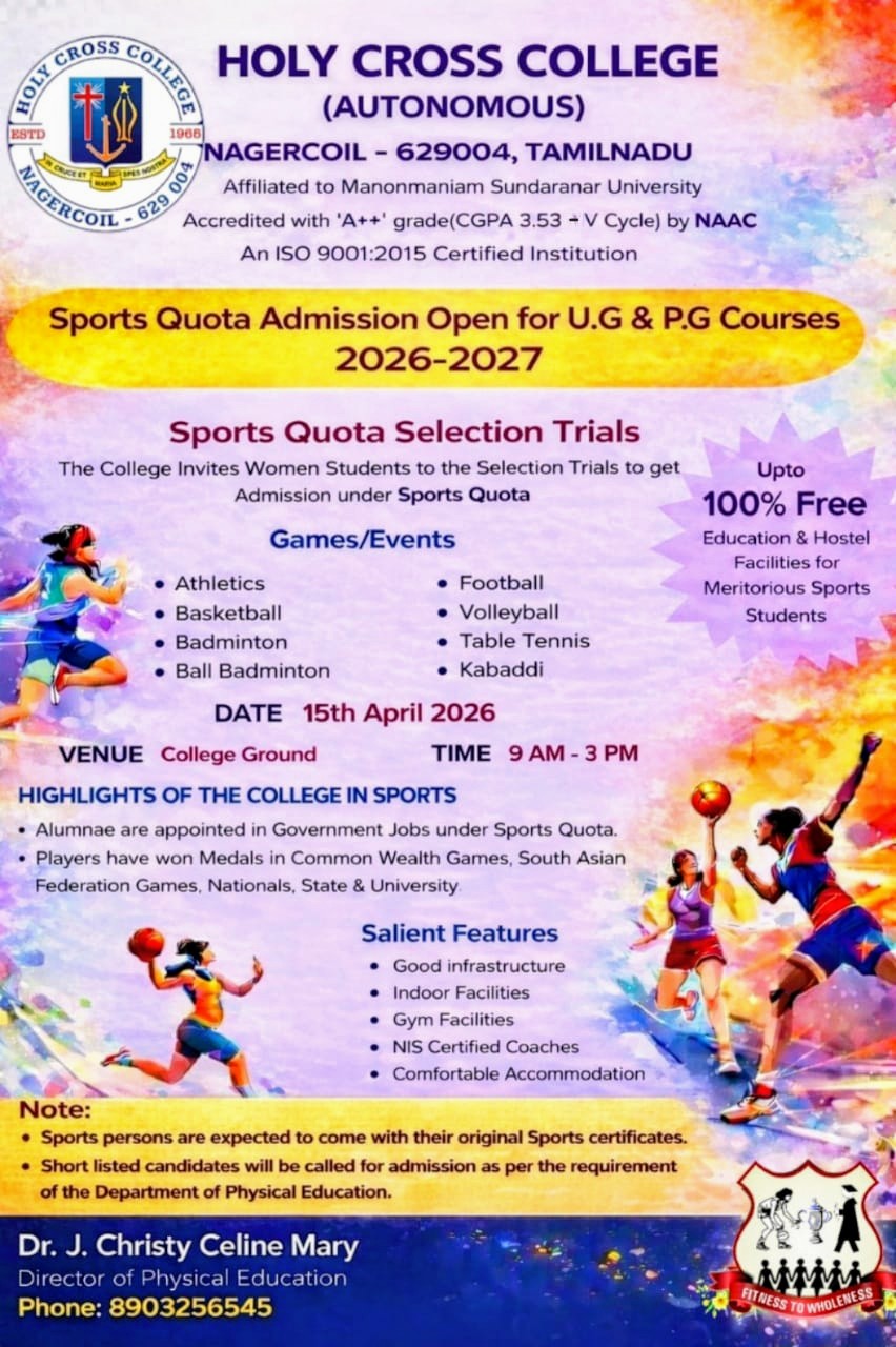 Holy Cross College was established in 1965 - the first women’s college in Kanyakumari district. It is a very prestigious college with a strong determination to empower women personally and professionally. I firmly believe that through education, women can fabricate an identity of their own. They can pursue their dreams and move ahead in their life with strong determination, respect, love, and faith. Under the efficient and committed management of the sisters of the Cross of Chavanod, the college continues to sow the seeds of education to women thereby nourishing them physically, emotionally, intellectually, spiritually, and socially.