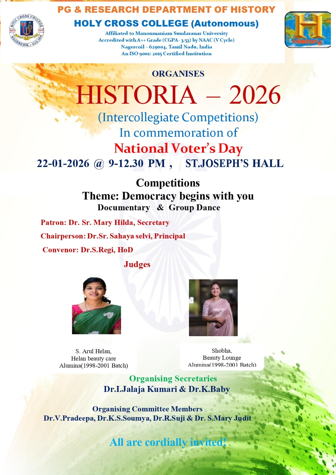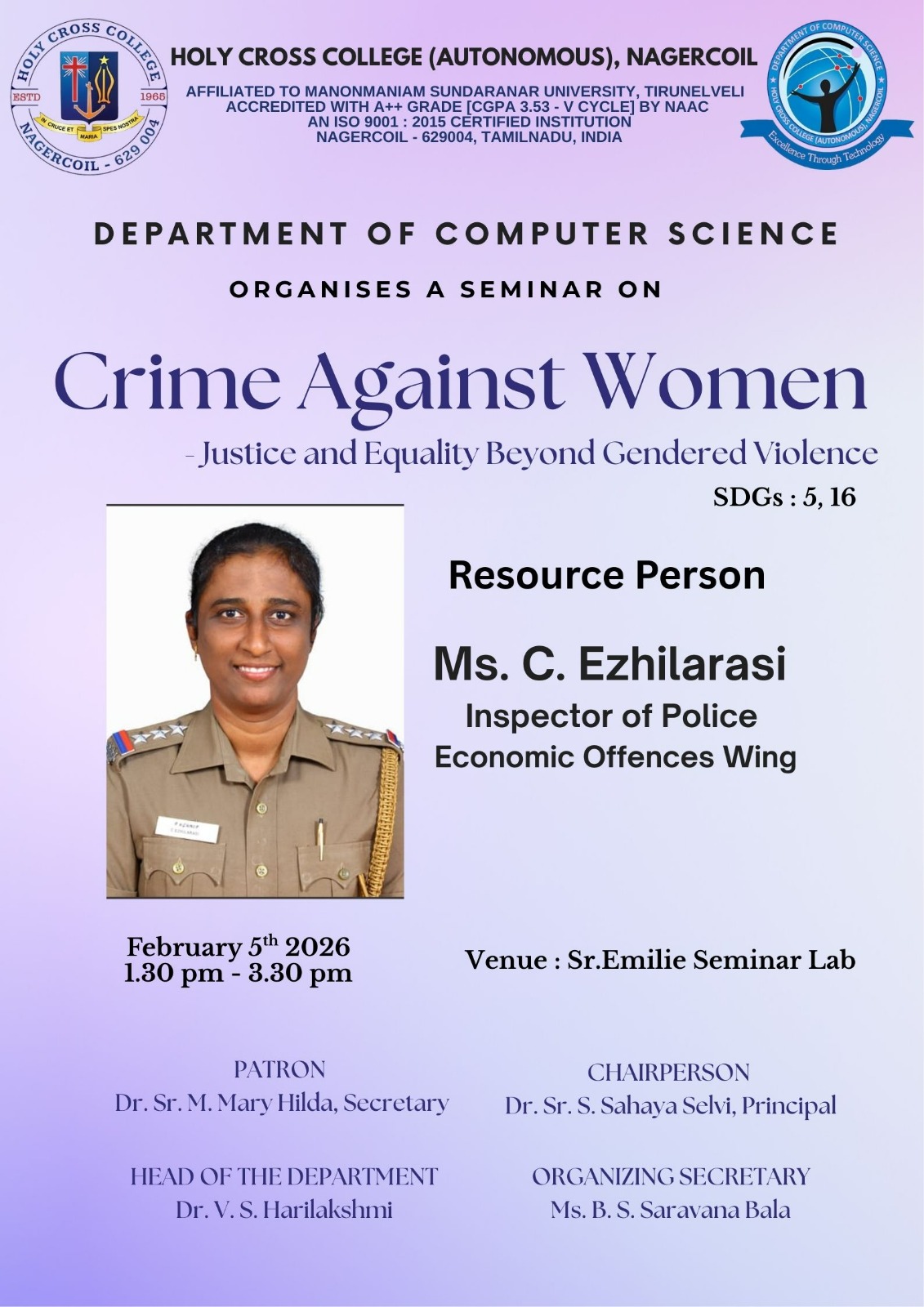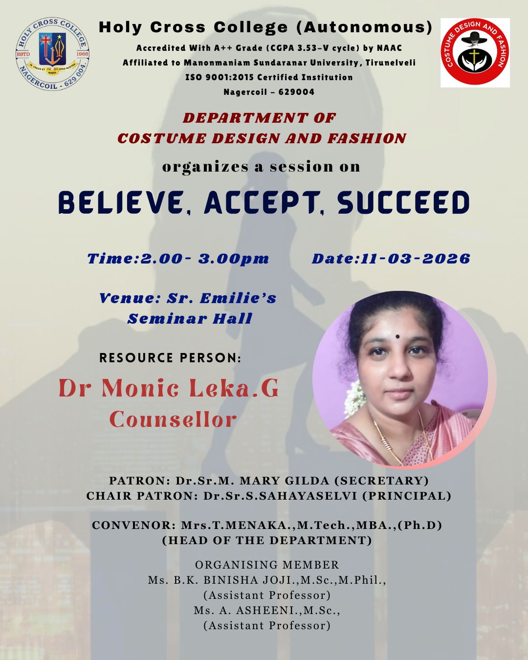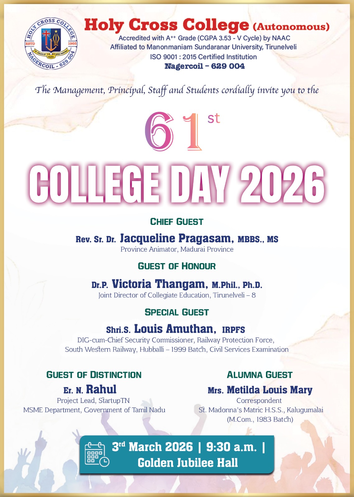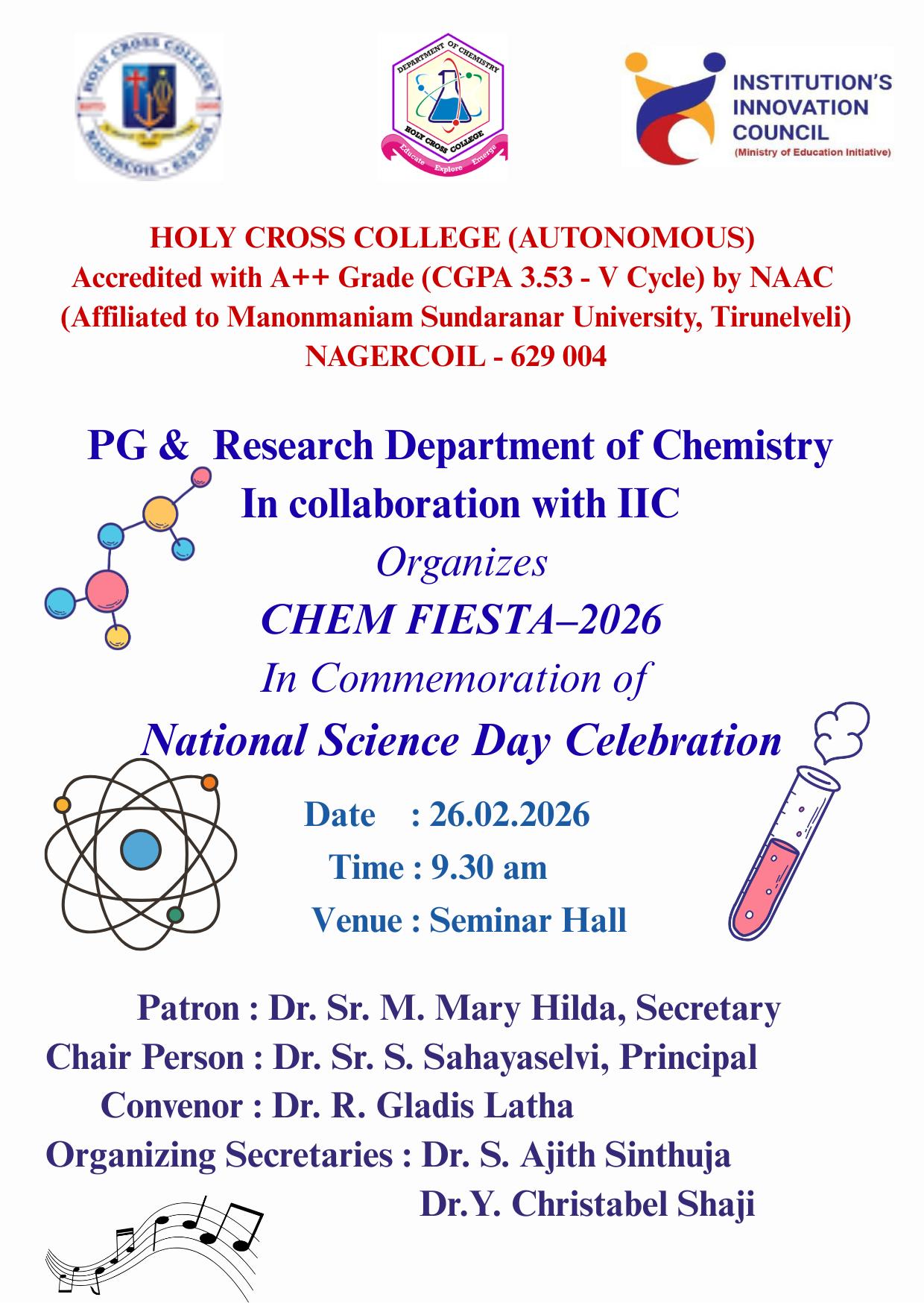 Holy Cross College was established in 1965 - the first women’s college in Kanyakumari district. It is a very prestigious college with a strong determination to empower women personally and professionally. I firmly believe that through education, women can fabricate an identity of their own. They can pursue their dreams and move ahead in their life with strong determination, respect, love, and faith. Under the efficient and committed management of the sisters of the Cross of Chavanod, the college continues to sow the seeds of education to women thereby nourishing them physically, emotionally, intellectually, spiritually, and socially.