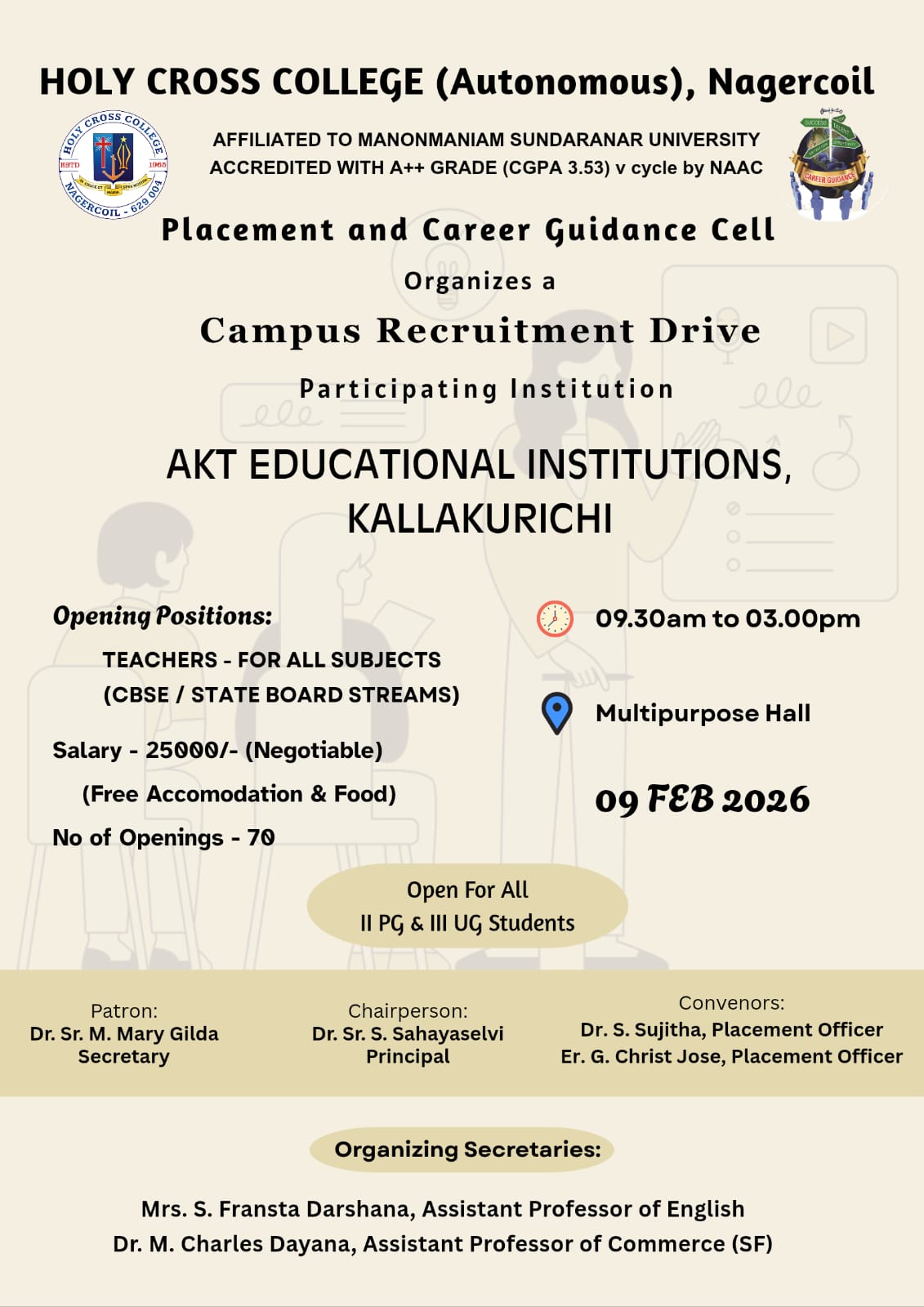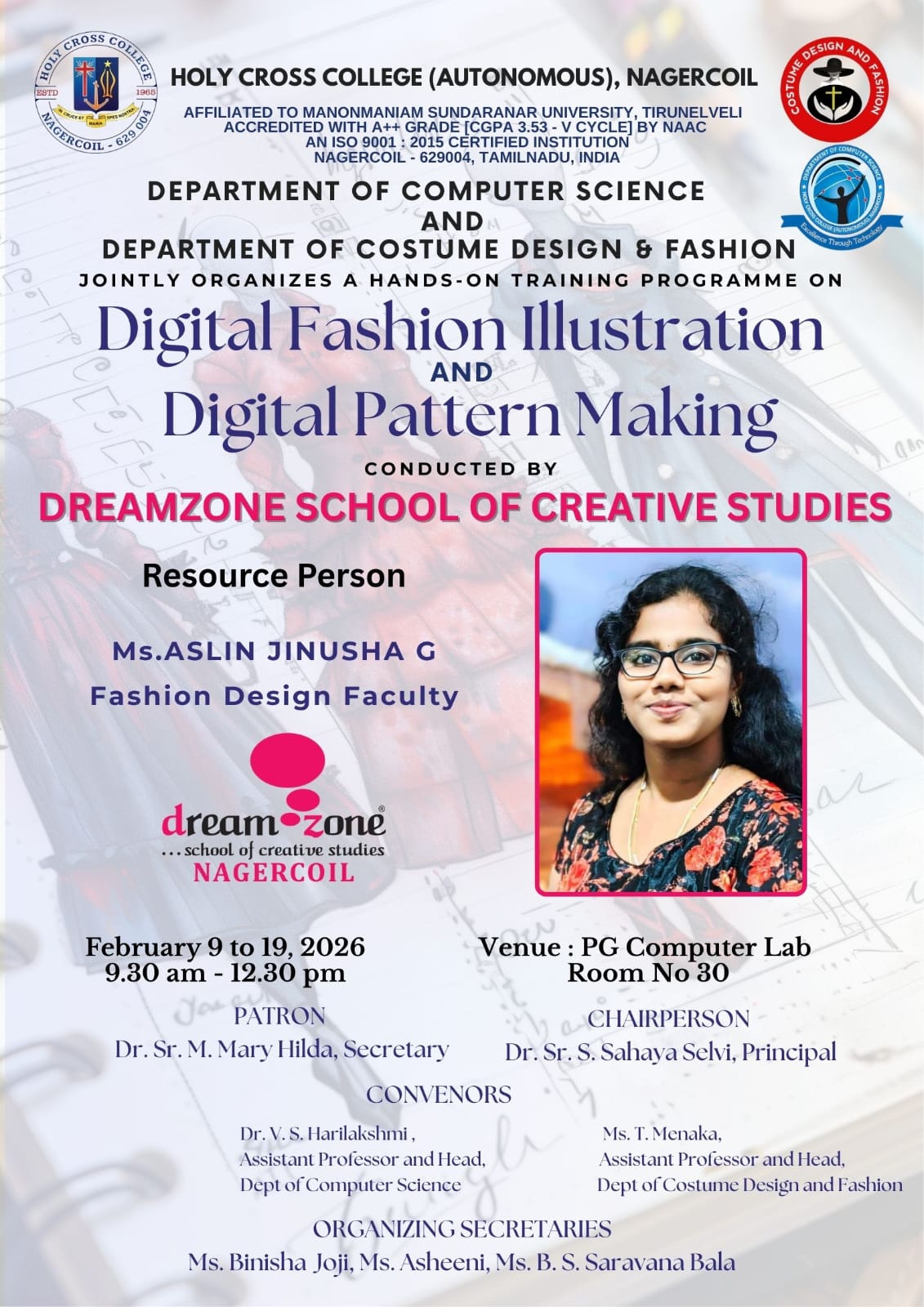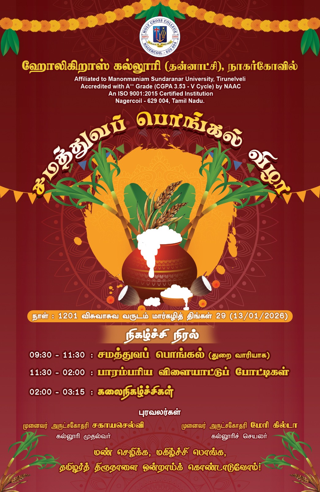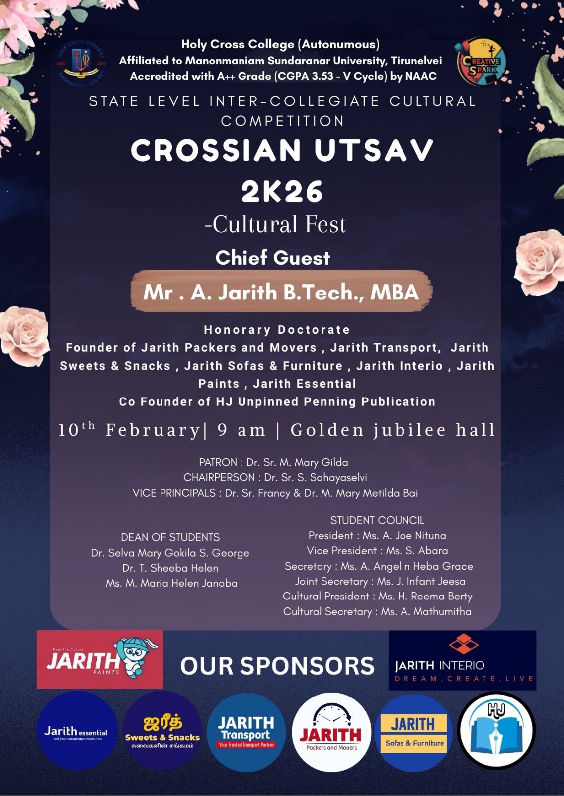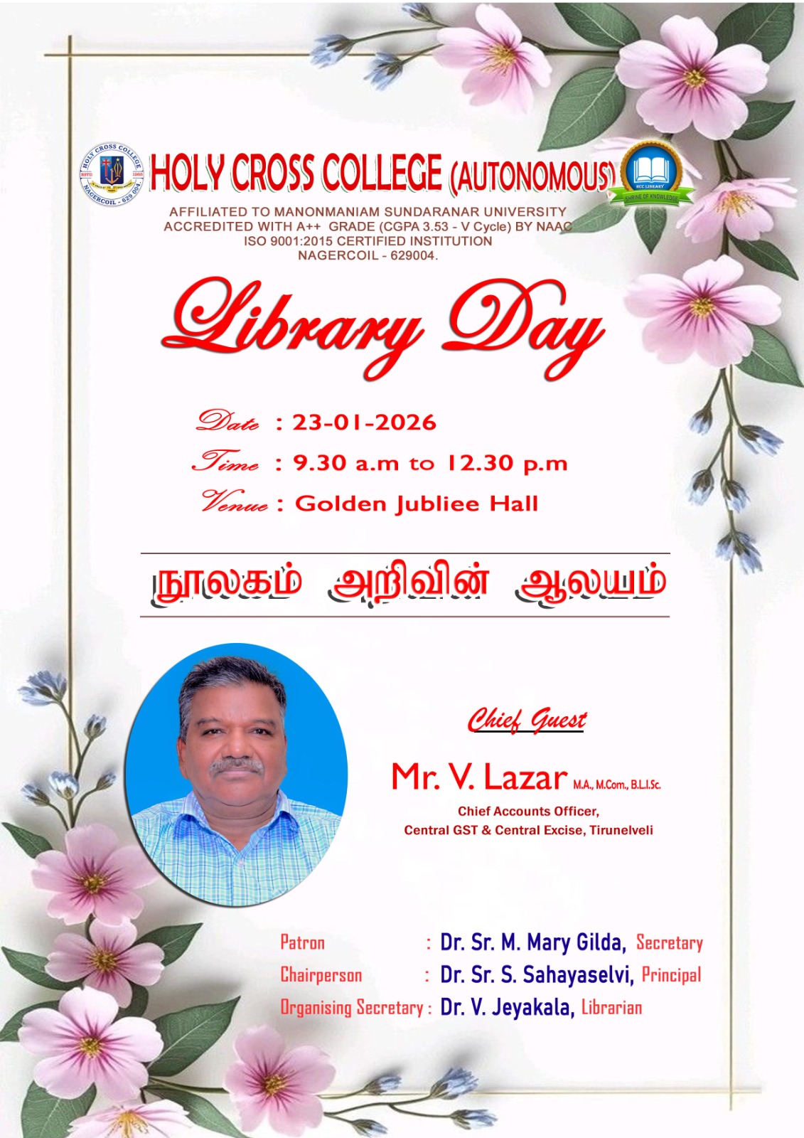 Holy Cross College was established in 1965 - the first women’s college in Kanyakumari district. It is a very prestigious college with a strong determination to empower women personally and professionally. I firmly believe that through education, women can fabricate an identity of their own. They can pursue their dreams and move ahead in their life with strong determination, respect, love, and faith. Under the efficient and committed management of the sisters of the Cross of Chavanod, the college continues to sow the seeds of education to women thereby nourishing them physically, emotionally, intellectually, spiritually, and socially.