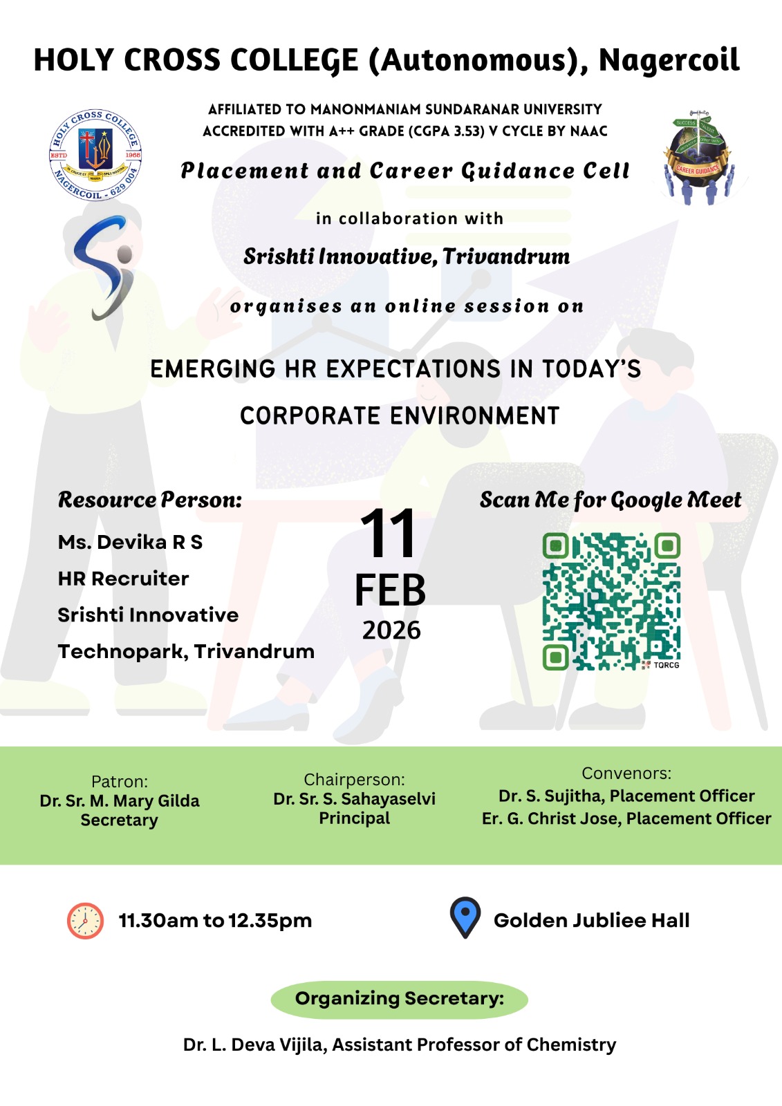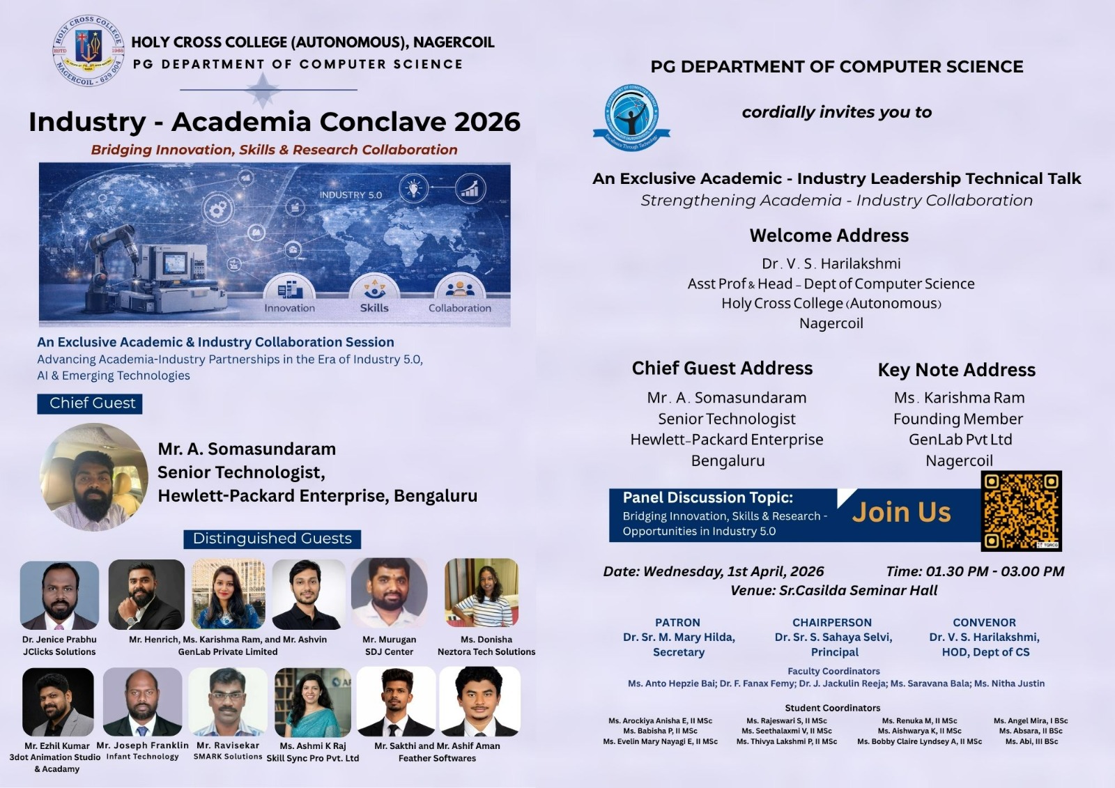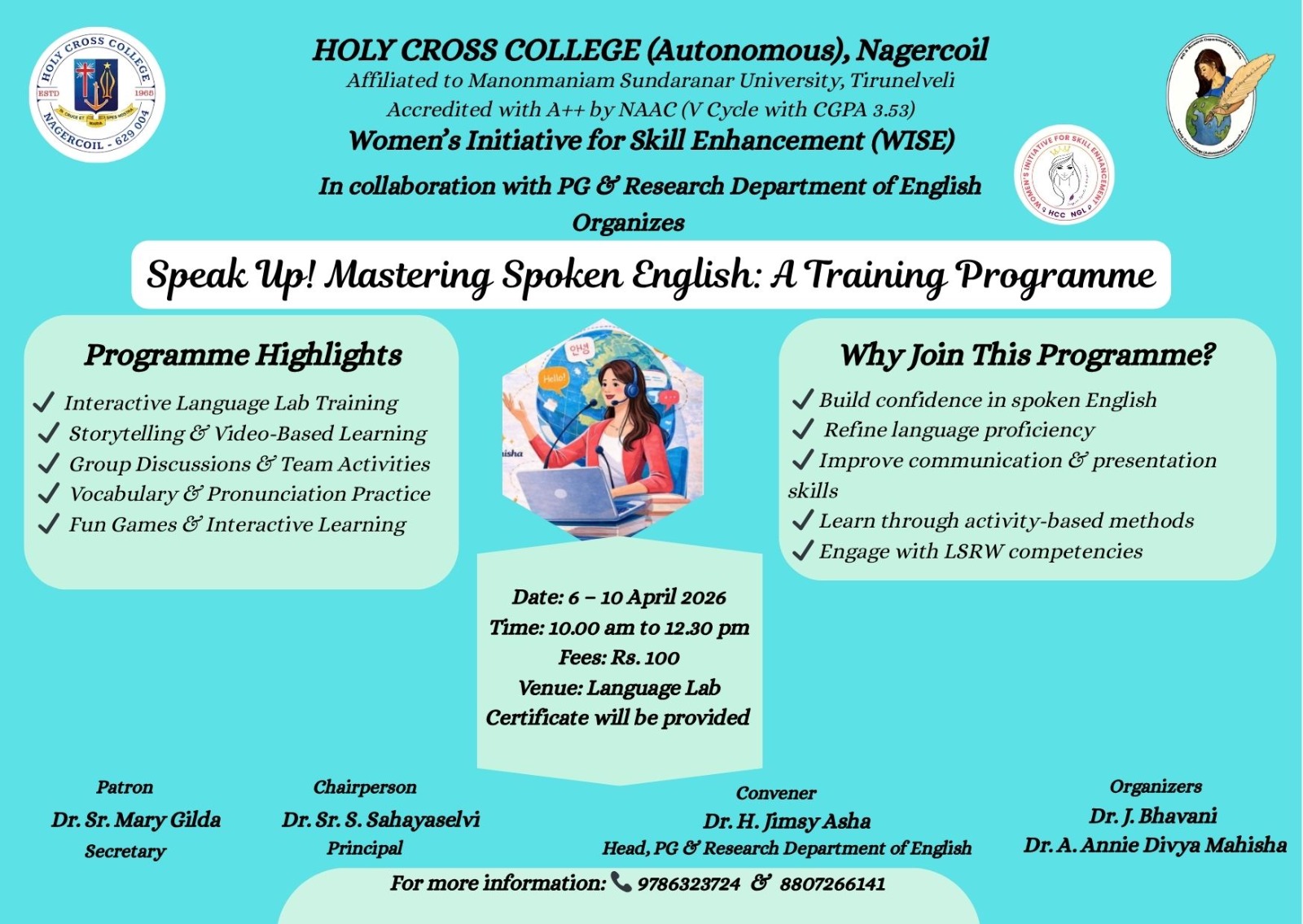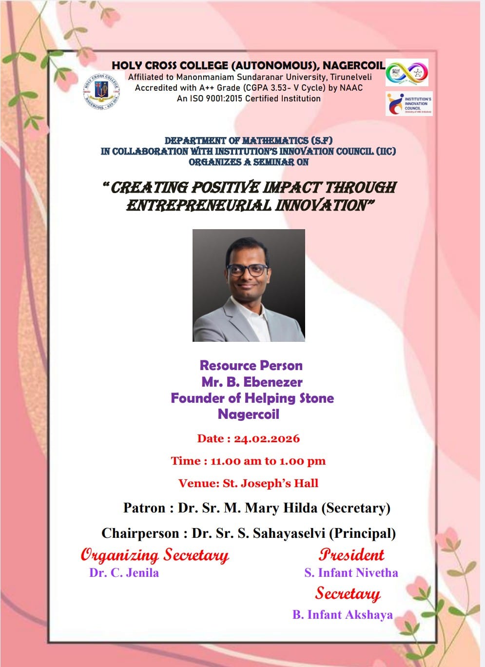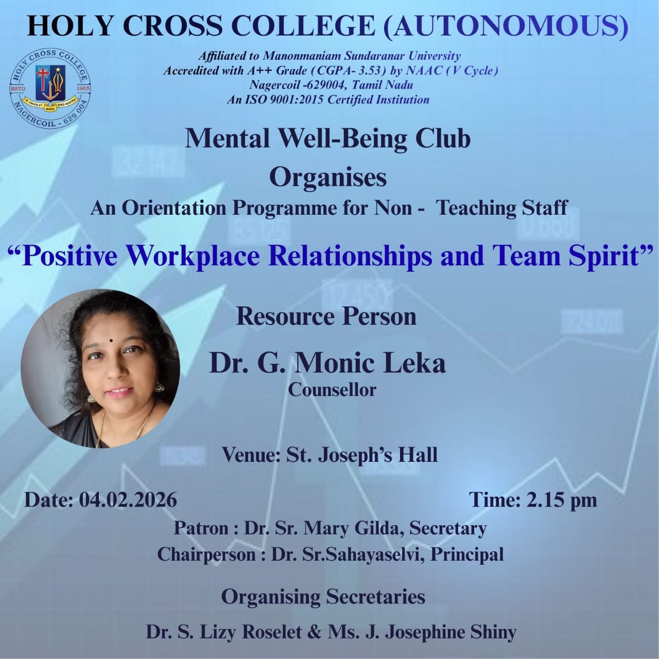 Holy Cross College was established in 1965 - the first women’s college in Kanyakumari district. It is a very prestigious college with a strong determination to empower women personally and professionally. I firmly believe that through education, women can fabricate an identity of their own. They can pursue their dreams and move ahead in their life with strong determination, respect, love, and faith. Under the efficient and committed management of the sisters of the Cross of Chavanod, the college continues to sow the seeds of education to women thereby nourishing them physically, emotionally, intellectually, spiritually, and socially.