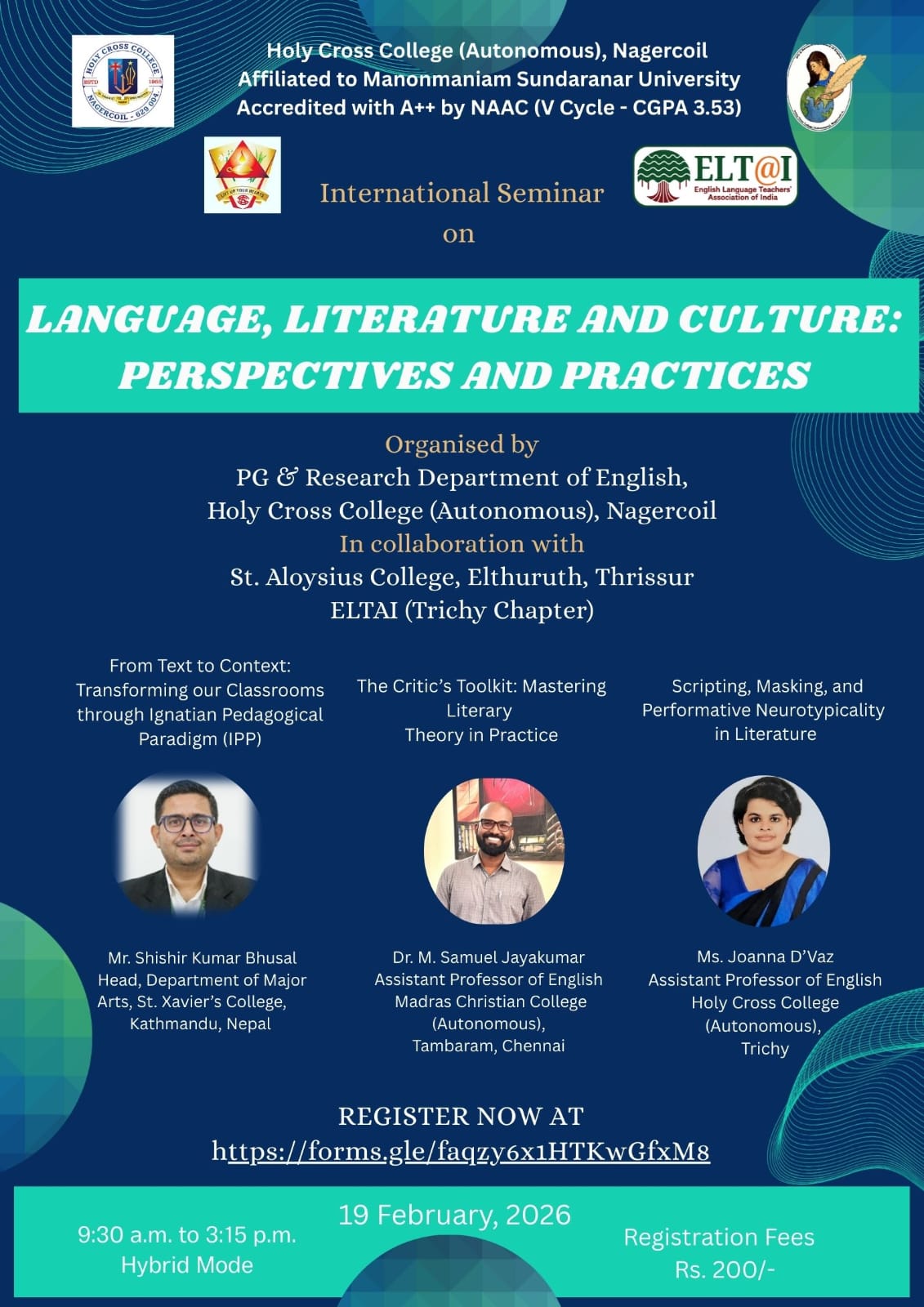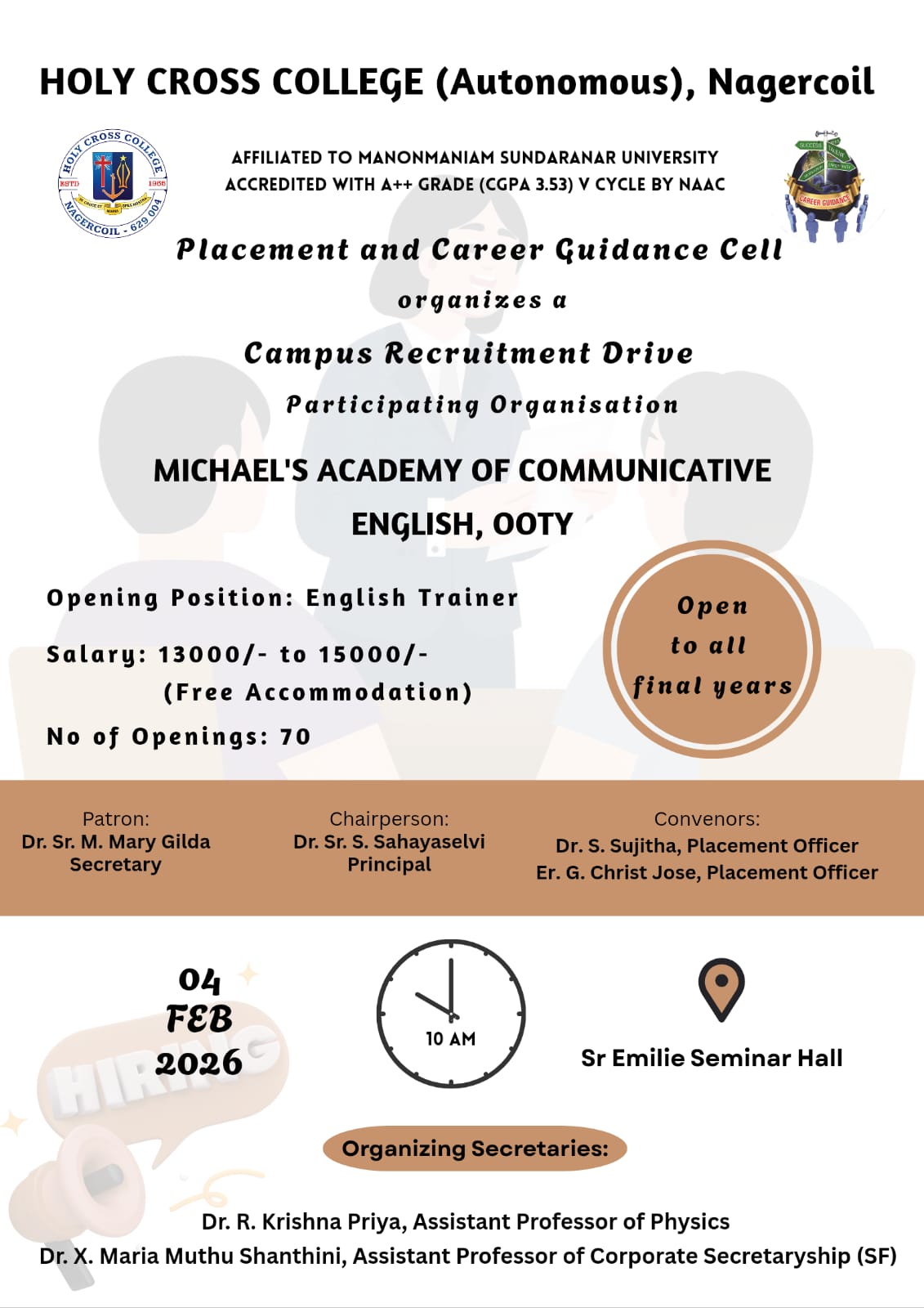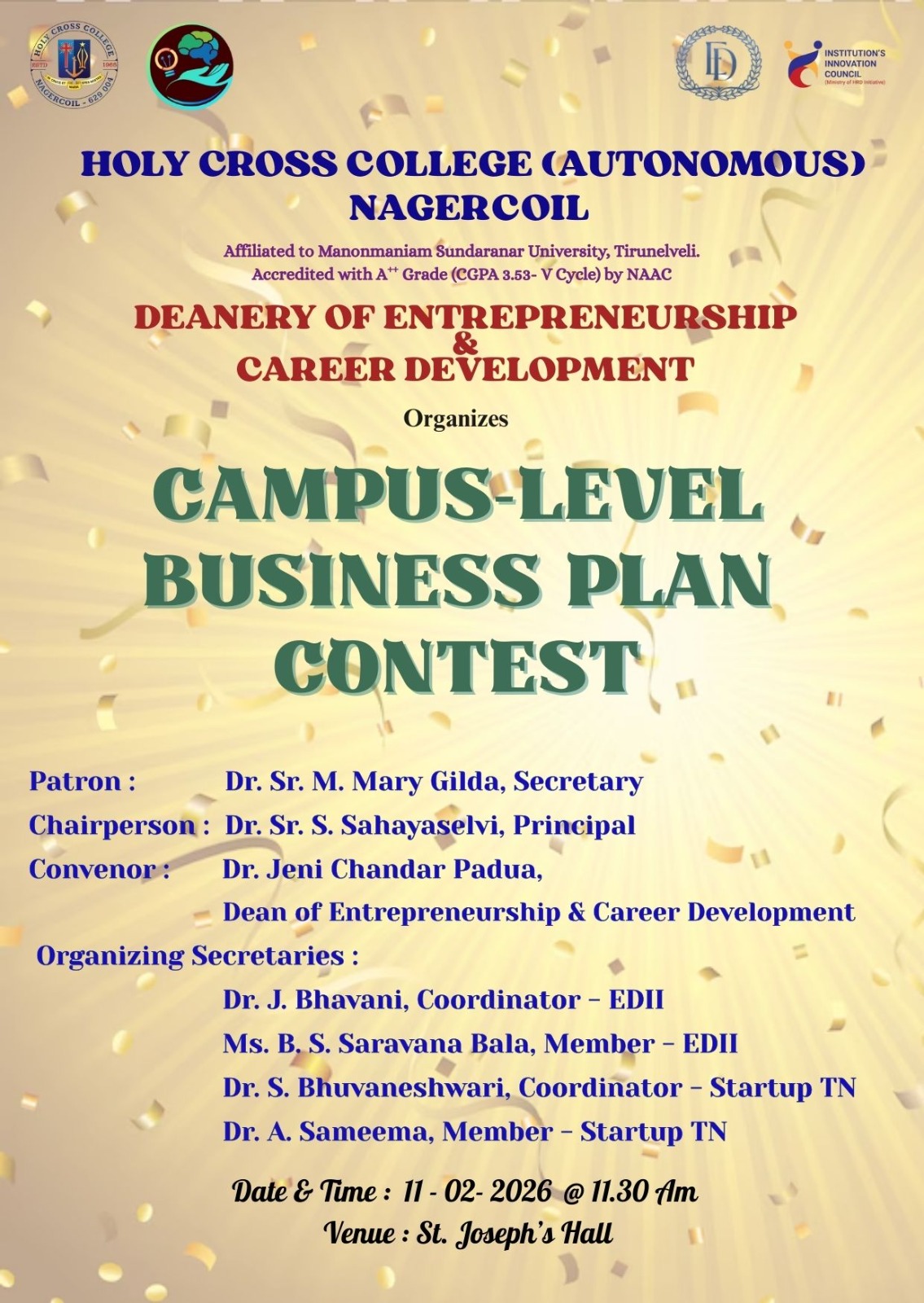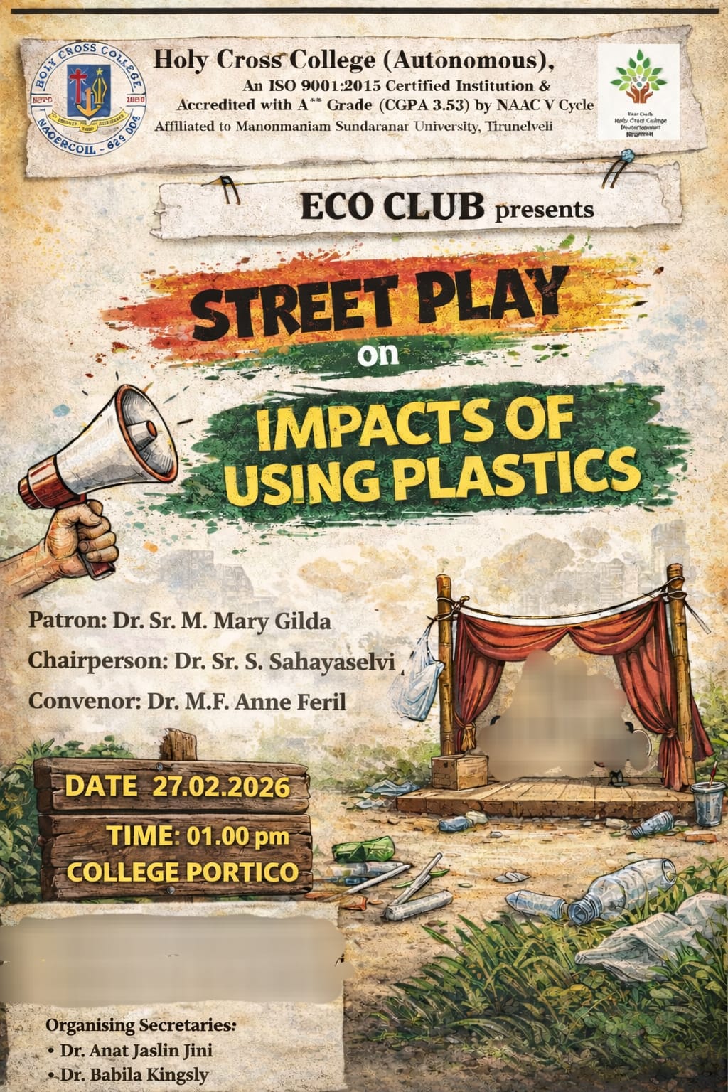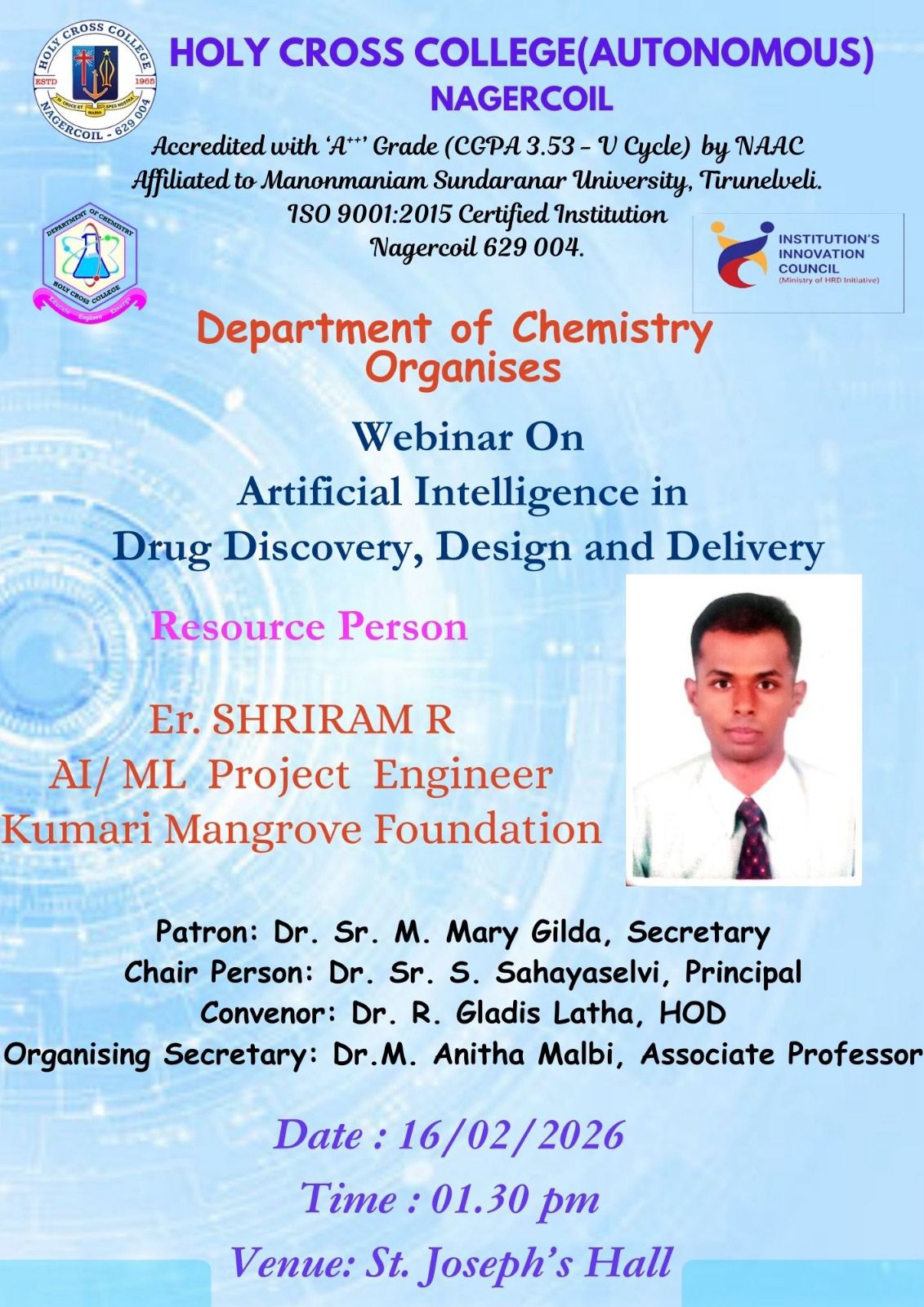 Holy Cross College was established in 1965 - the first women’s college in Kanyakumari district. It is a very prestigious college with a strong determination to empower women personally and professionally. I firmly believe that through education, women can fabricate an identity of their own. They can pursue their dreams and move ahead in their life with strong determination, respect, love, and faith. Under the efficient and committed management of the sisters of the Cross of Chavanod, the college continues to sow the seeds of education to women thereby nourishing them physically, emotionally, intellectually, spiritually, and socially.